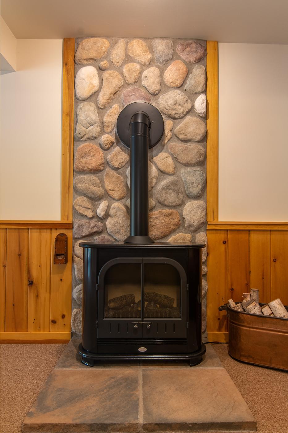 Fireplace Characteristics: Circulating Blower; Electric; Family Room; Living Room; Stone; Wood Burning