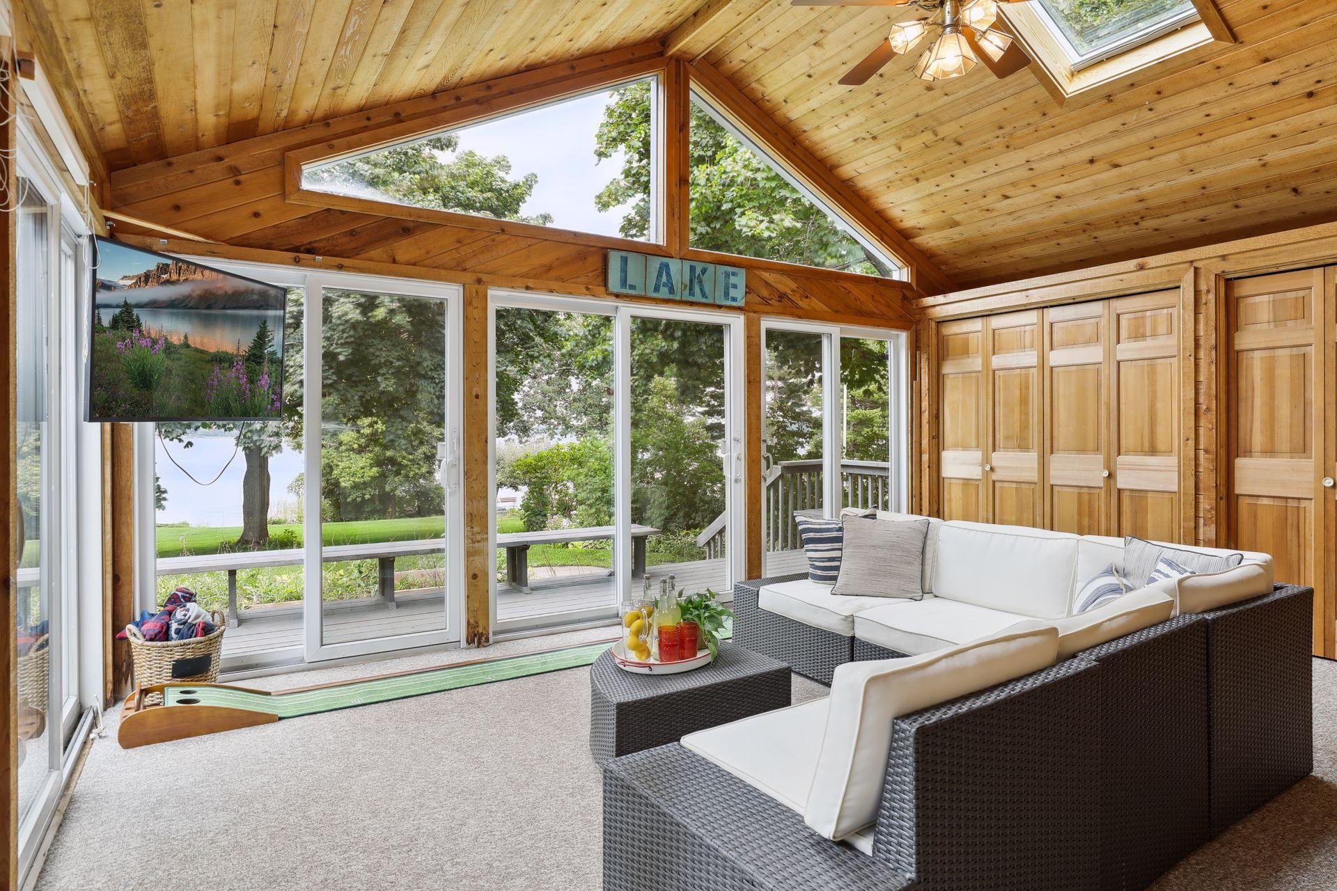 Public Remarks: Welcome to 2215 S. Shore Blvd! This 4 BR, 3 BA home sits on a beautiful ONE acre lot, with 122’ of prime, well manicured lakeshore. Wonderfully remodeled with an open floor plan, gourmet kitchen w/ high end appliances, lovely wood floors, and modernized bathrooms…you will love the panoramic views of the lake and the large yard leading to it. The owners’ suite enjoys excellent views of the lake, and walks out to deck and hot tub. Embrace your best lake living here! Whether it’s morning coffee, evening sunsets, or everything in between…the home’s expansive deck and 3-season porch are just the cherry on top. The large horseshoe driveway wraps around additional street-side green space, perfect for the potential of adding an additional garage, or simply enjoying more room to play.