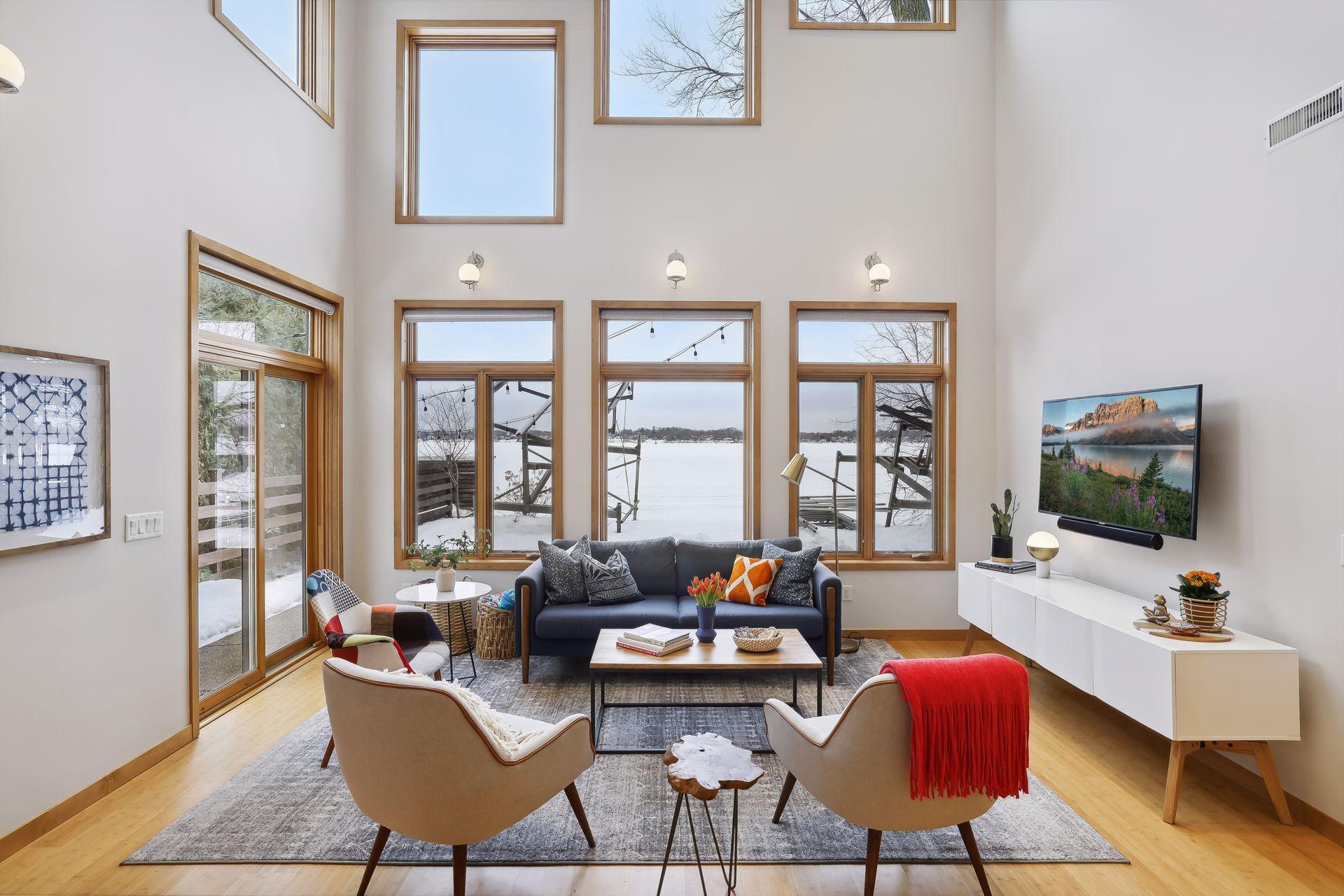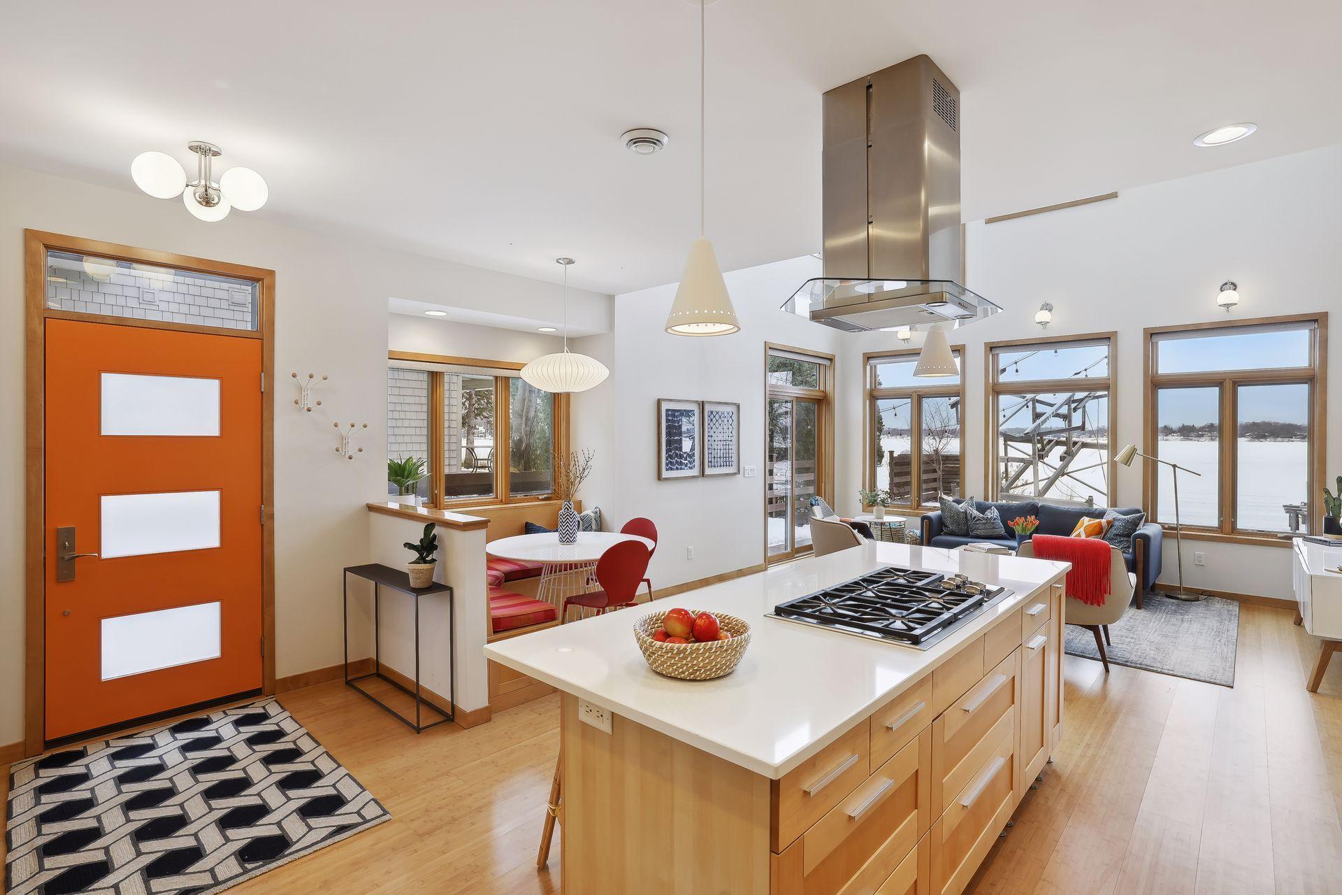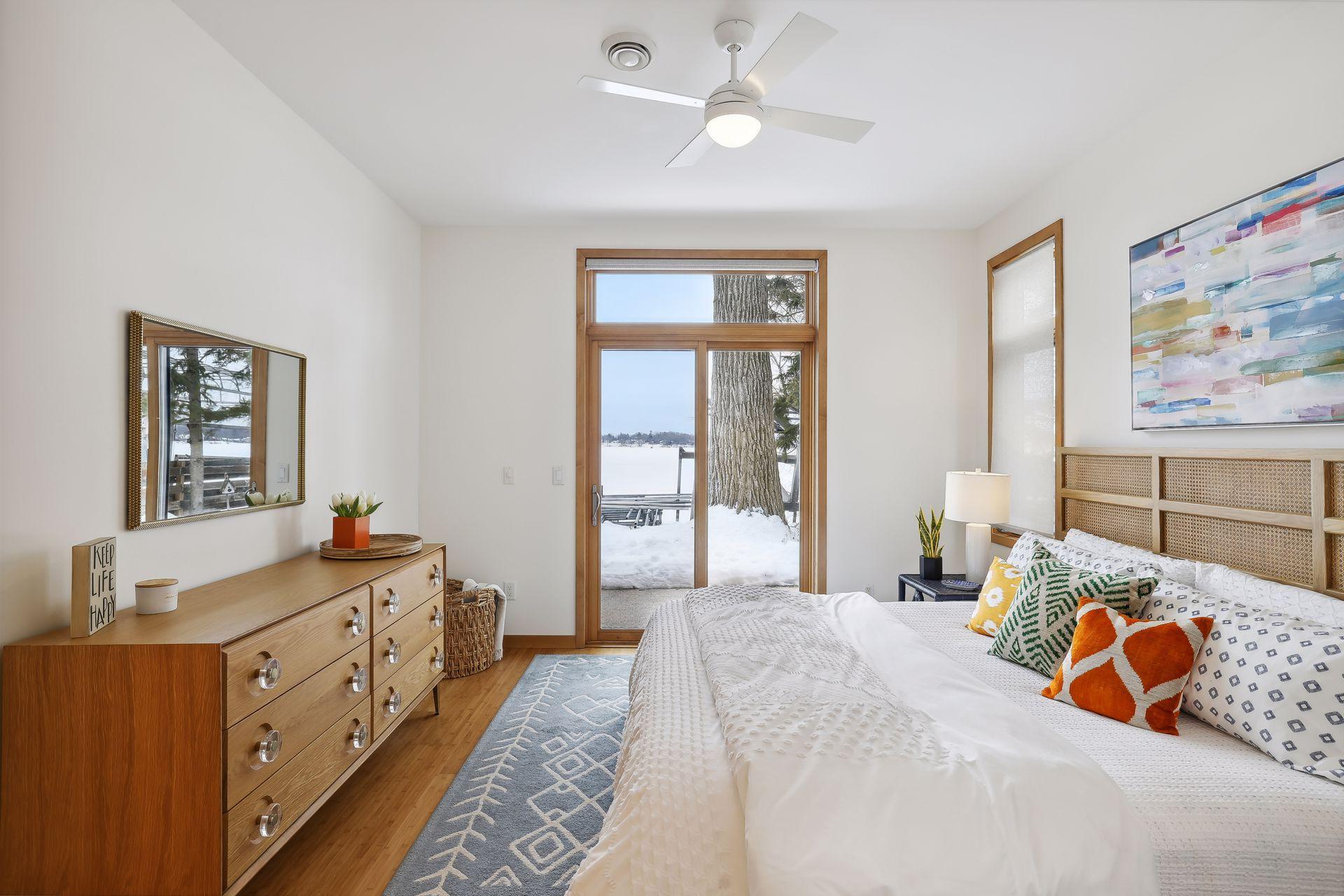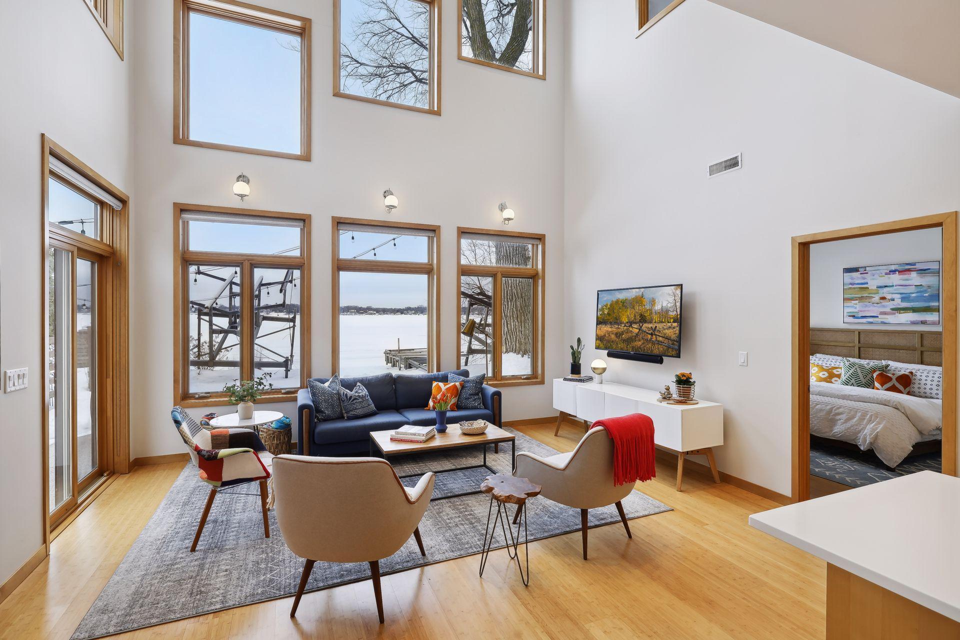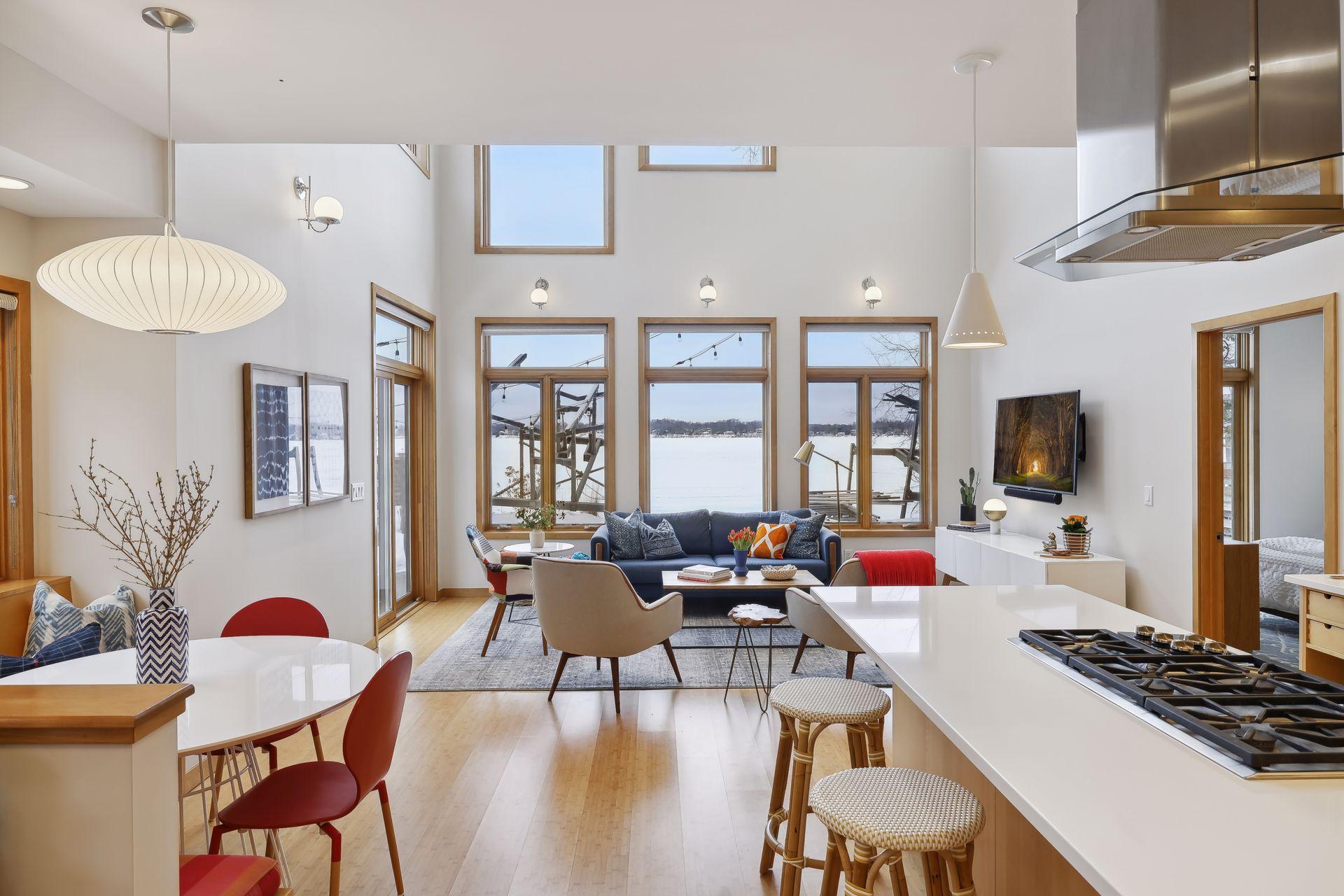 serve. Just off the living room is a generously sized patio for indoor-outdoor lakeside living. The midcentury mod provides the choice of a main floor primary lakeside suite or a more private upstairs suite.