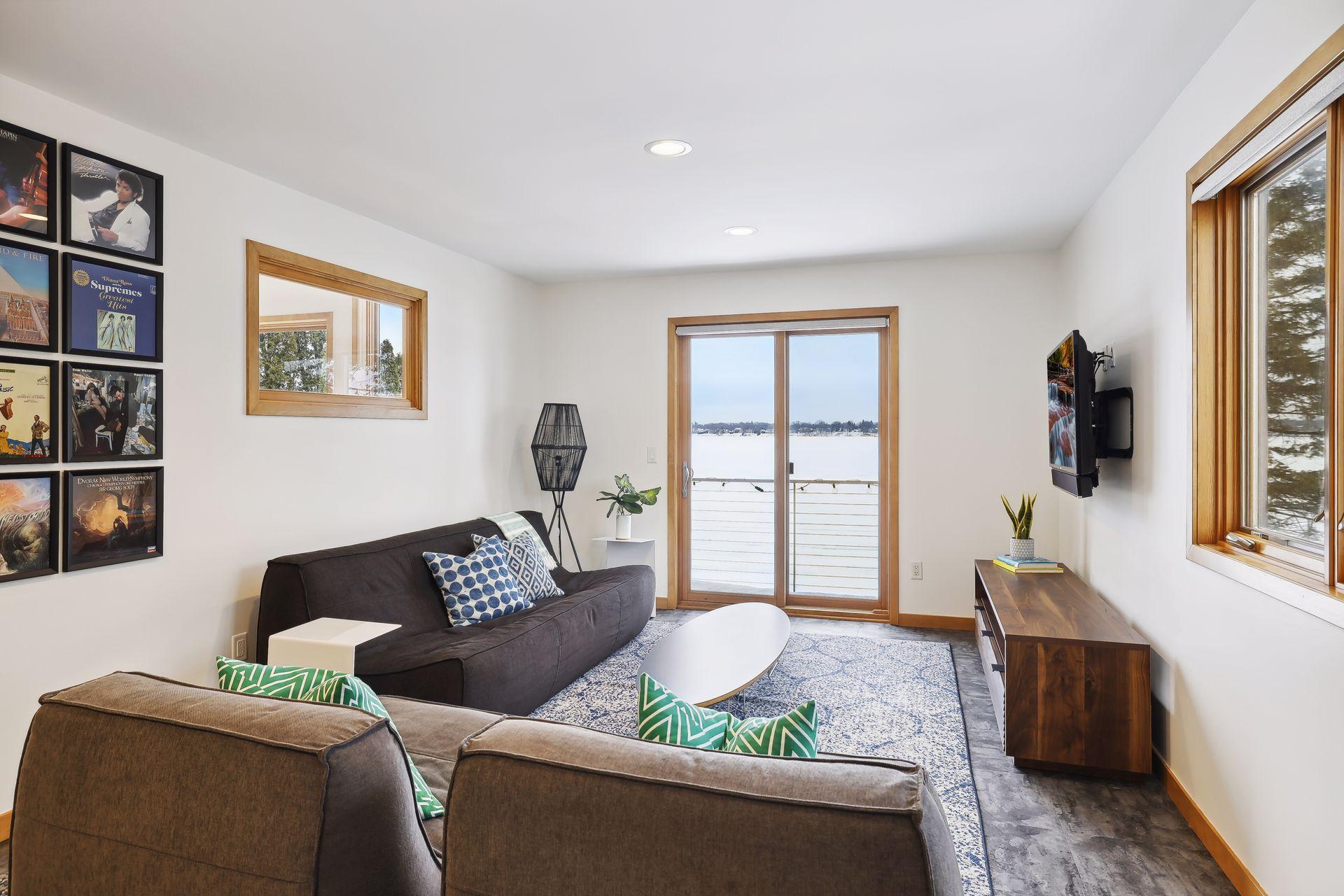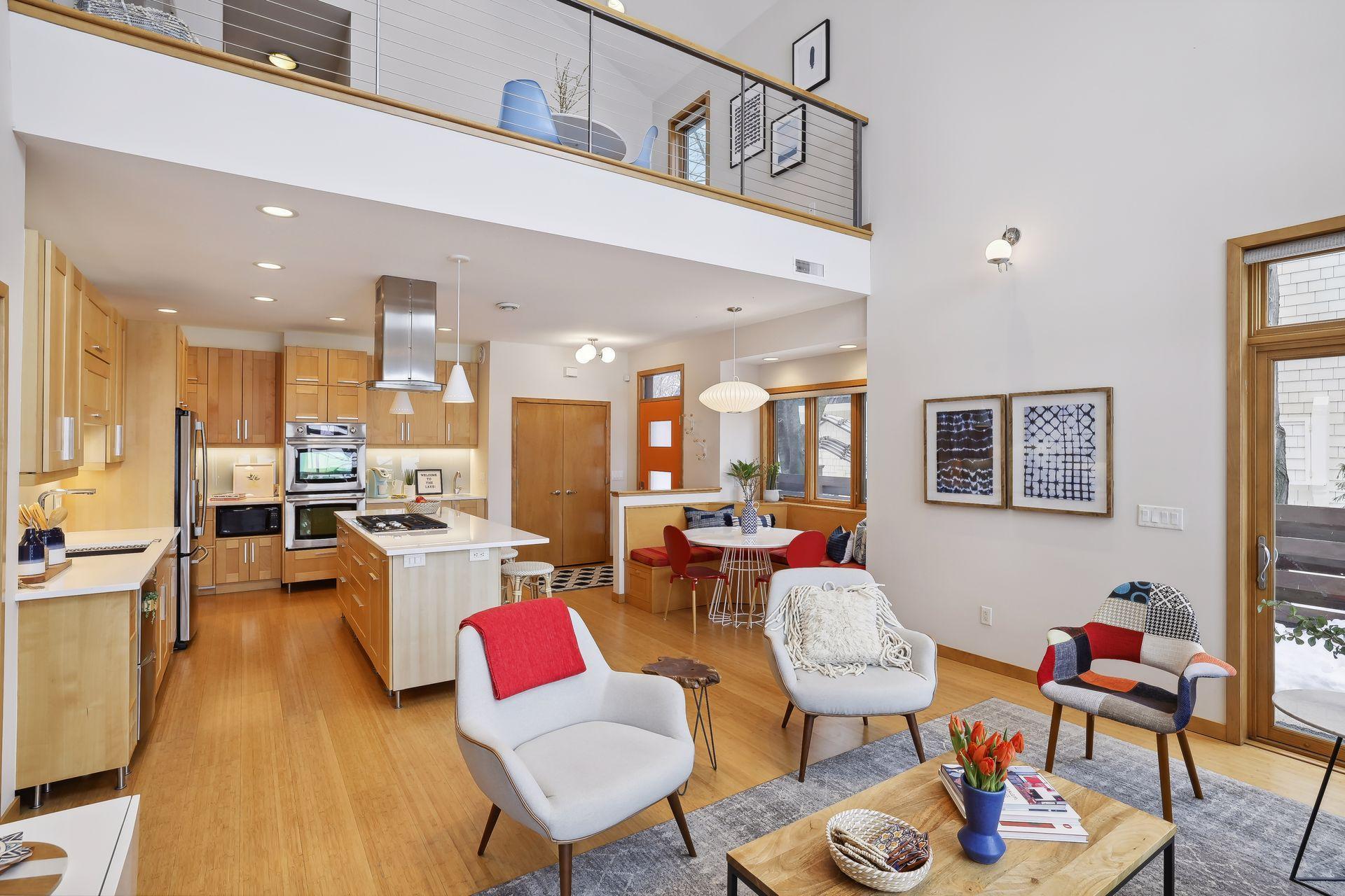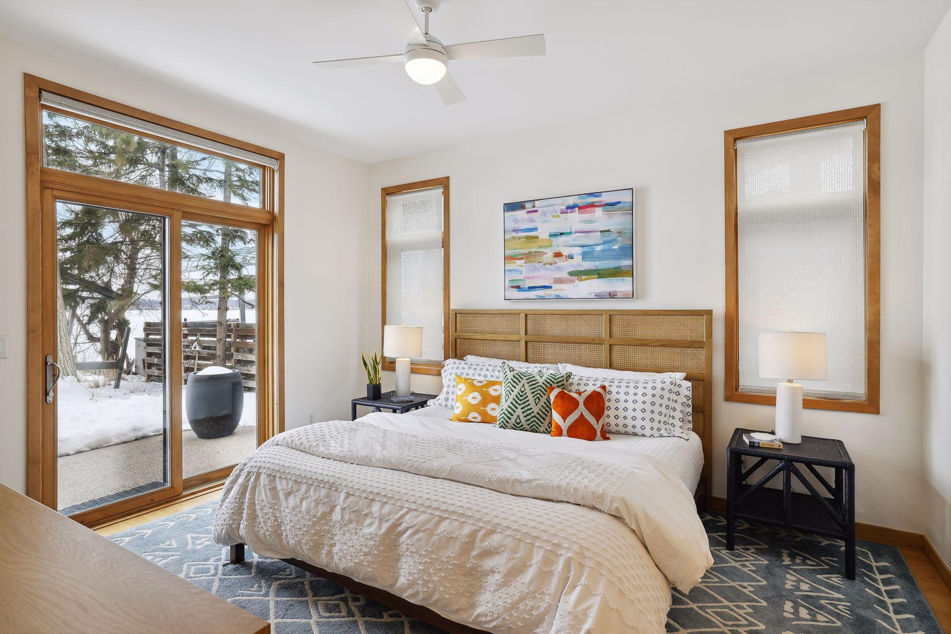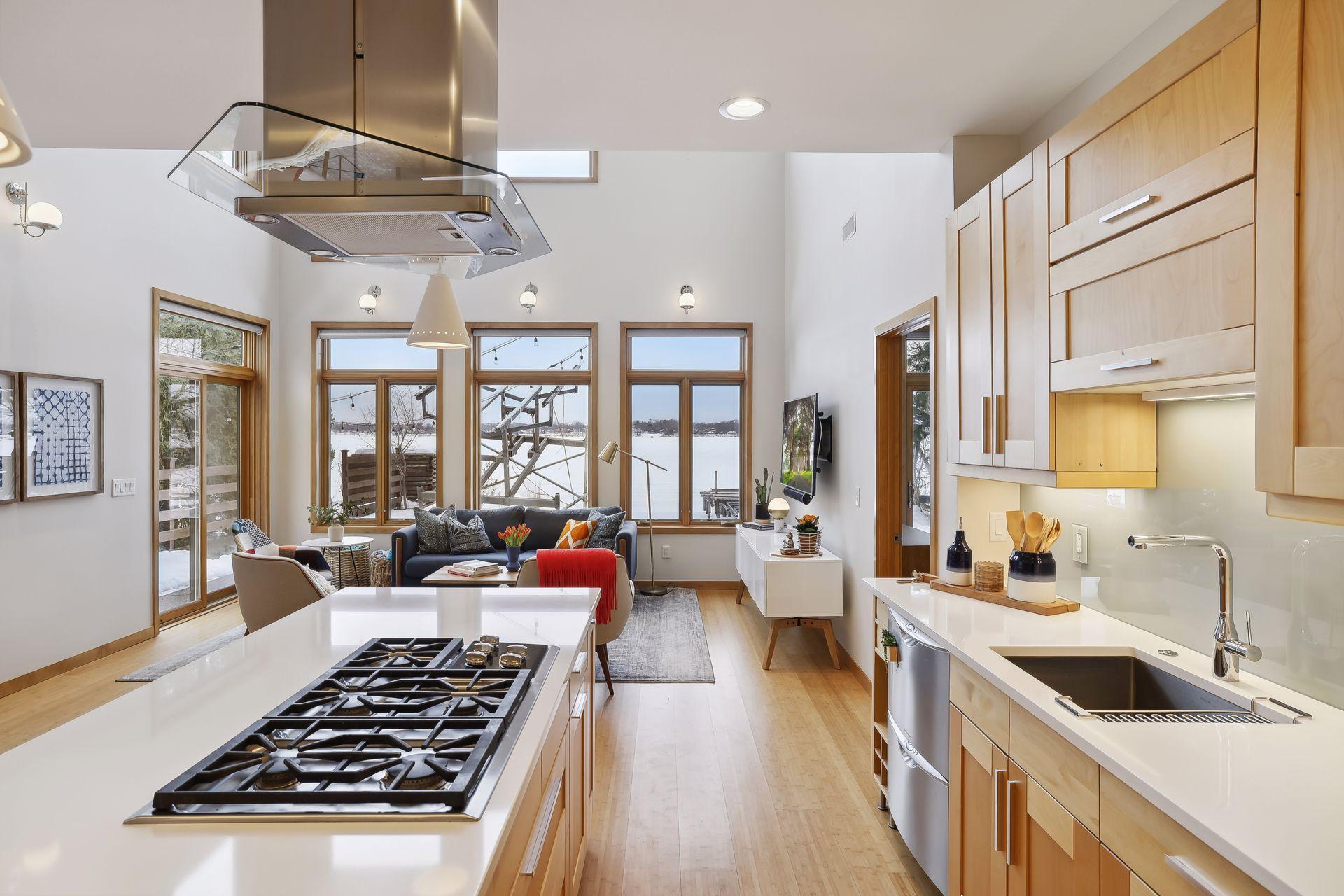 serve. Just off the living room is a generously sized patio for indoor-outdoor lakeside living. The midcentury mod provides the choice of a main floor primary lakeside suite or a more private upstairs suite.