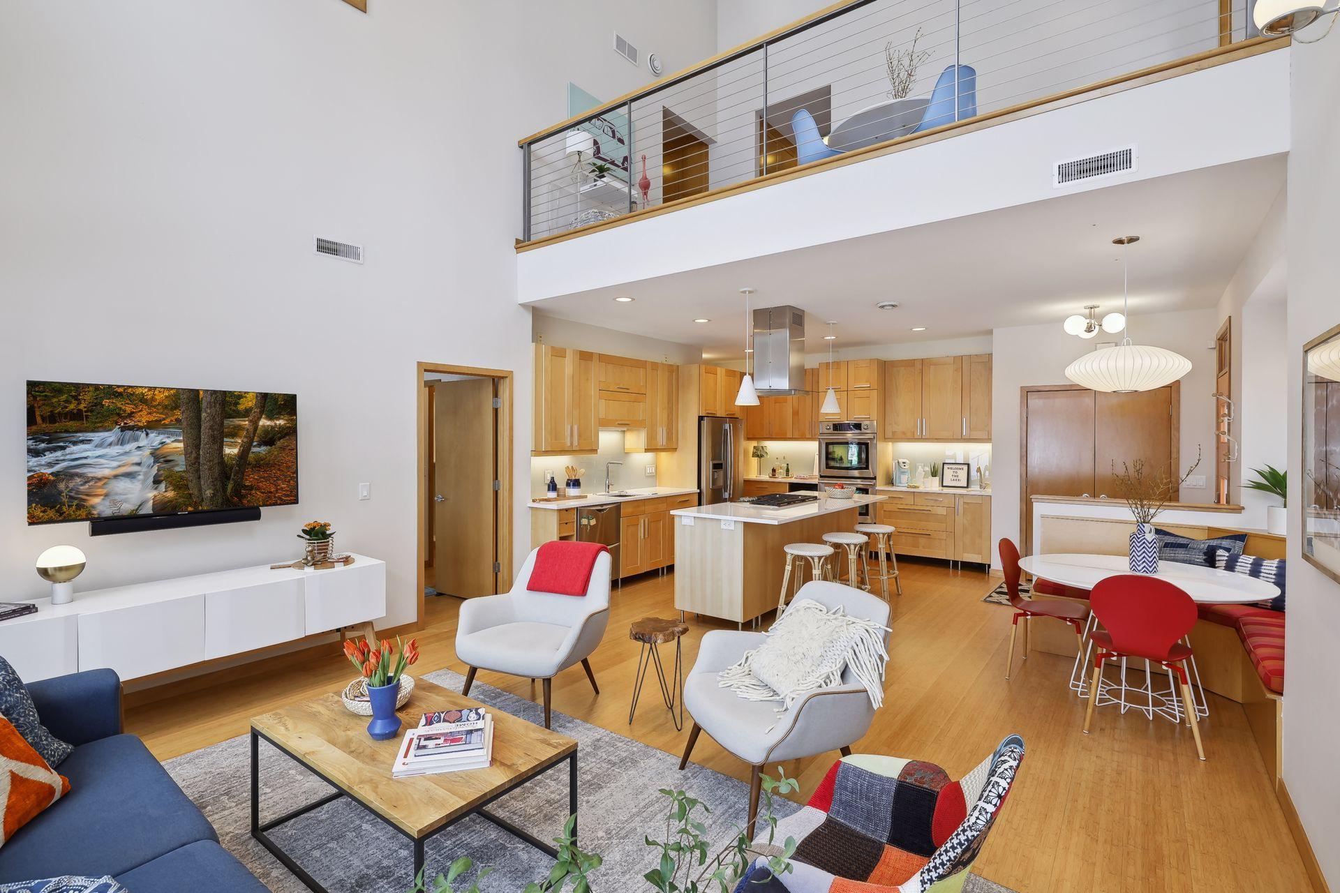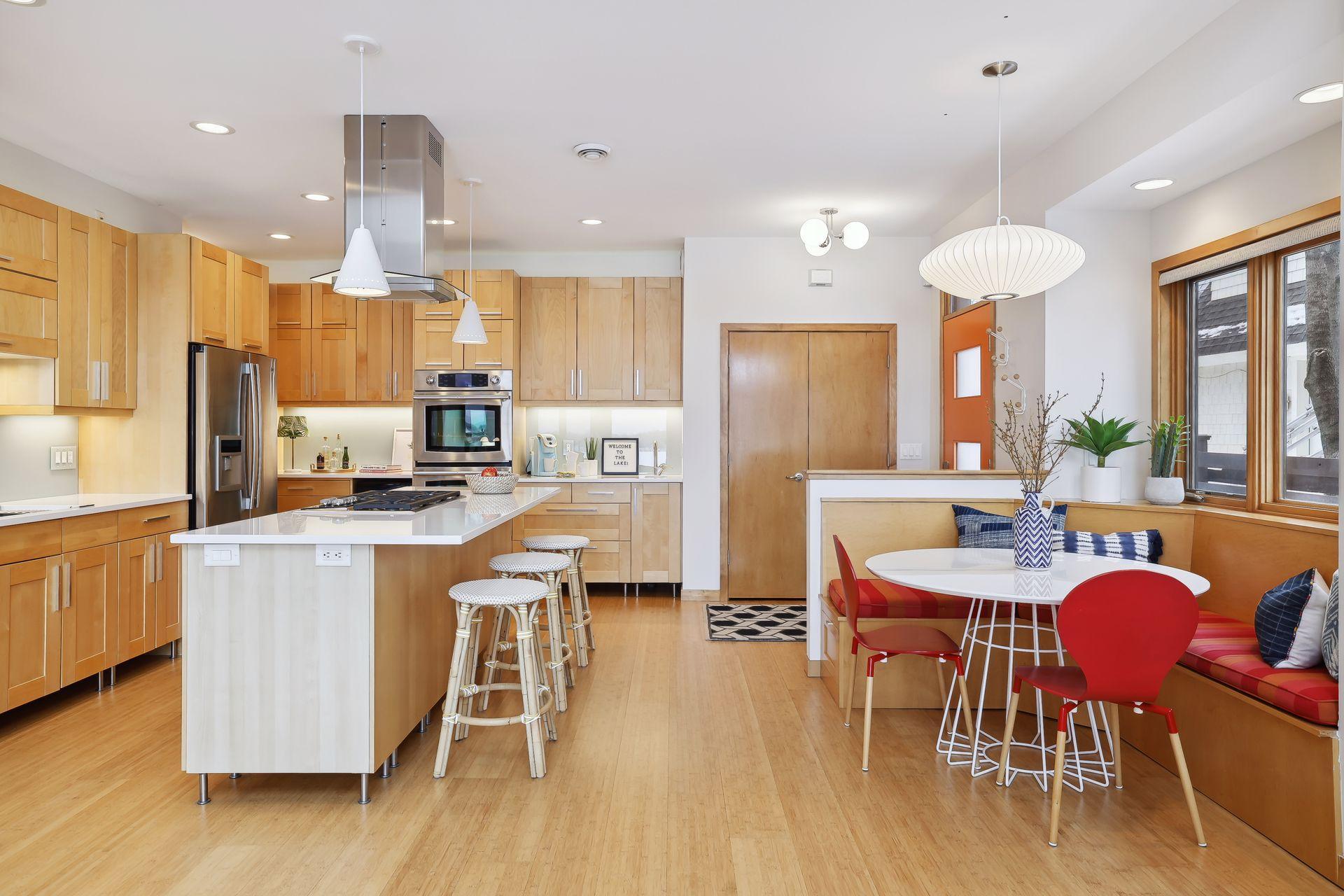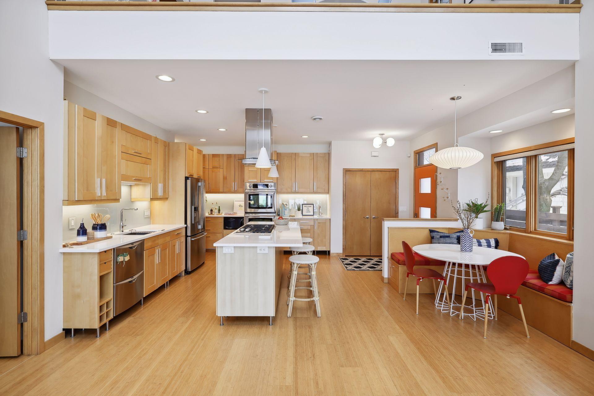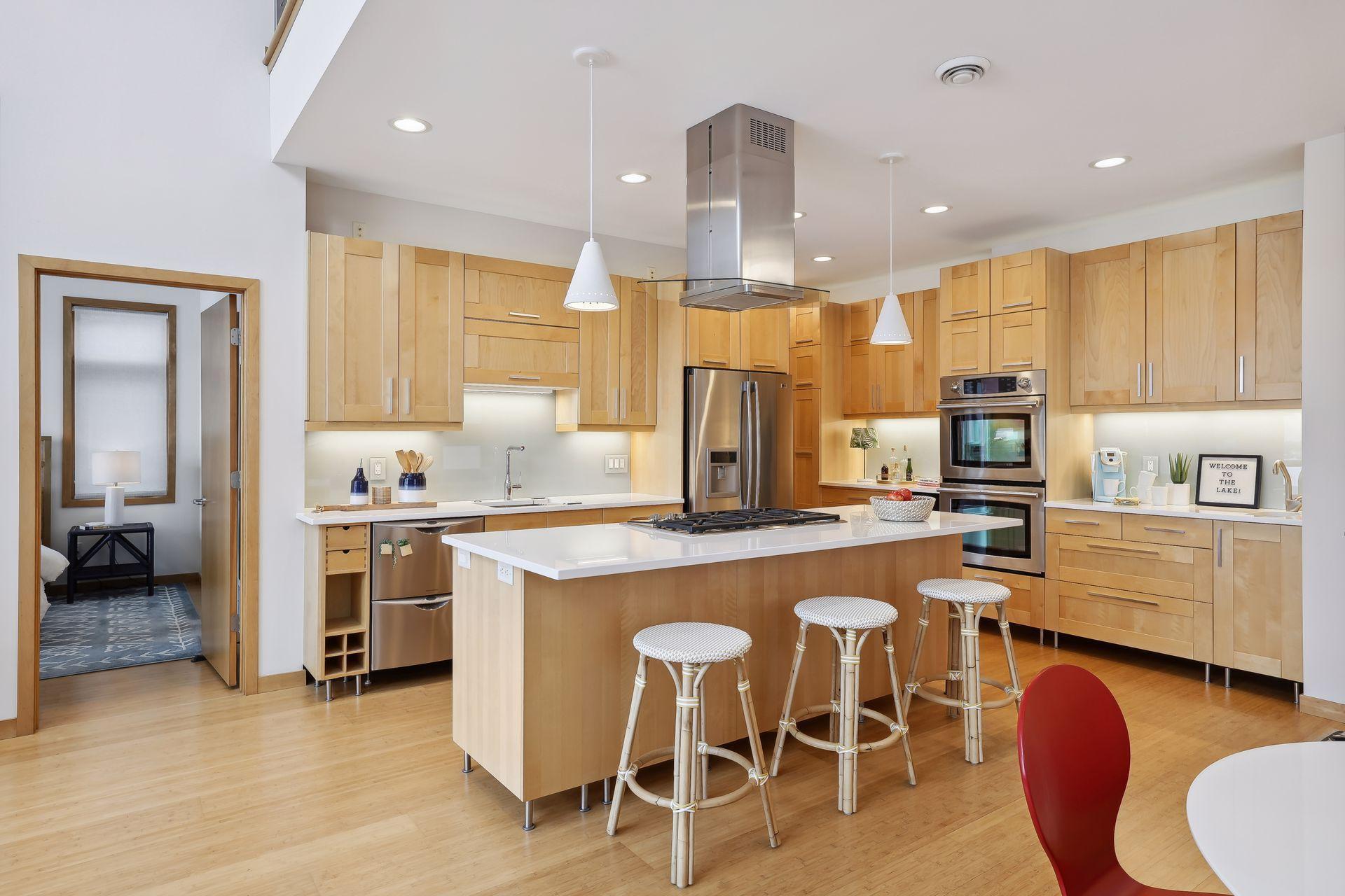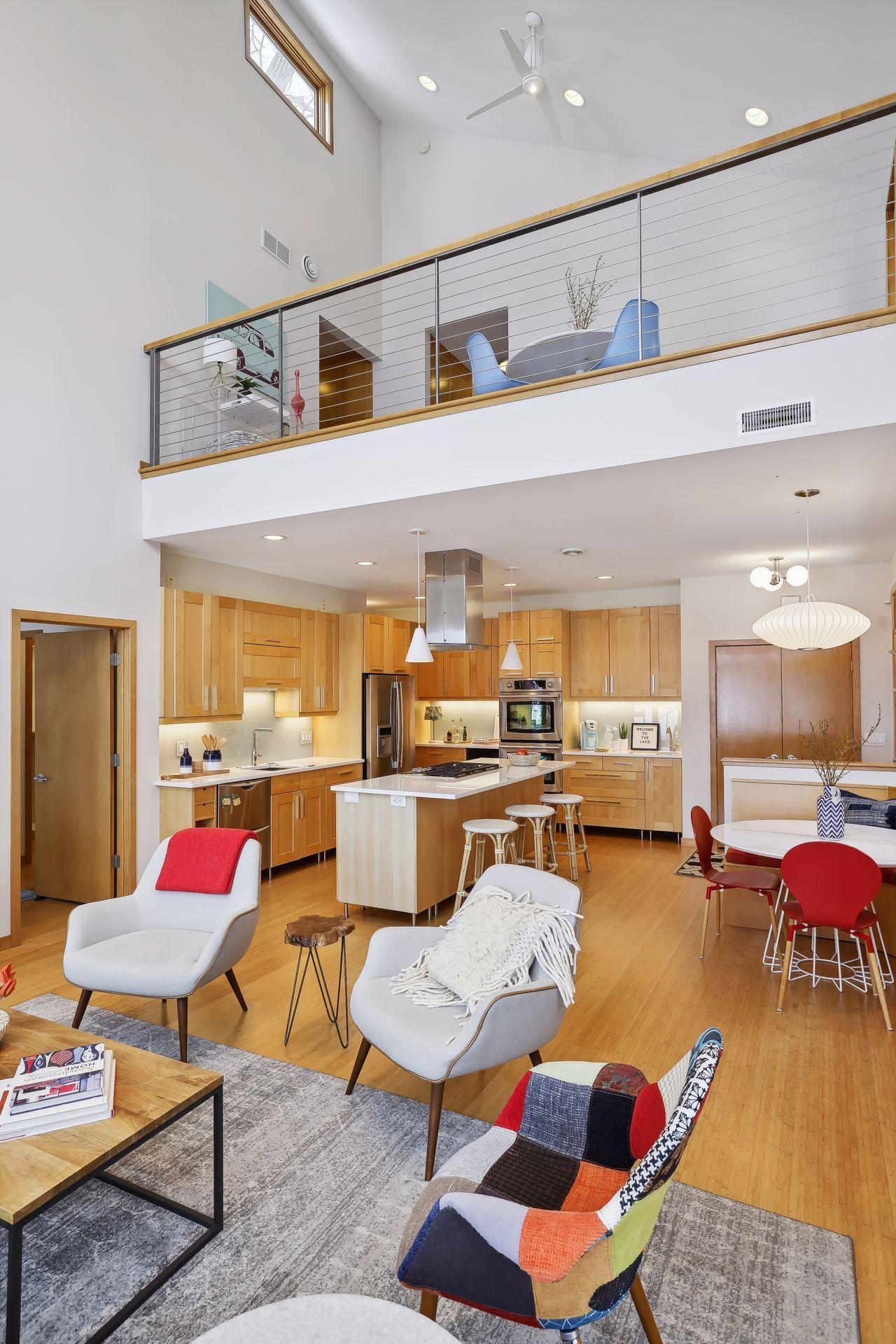 serve. Just off the living room is a generously sized patio for indoor-outdoor lakeside living. The midcentury mod provides the choice of a main floor primary lakeside suite or a more private upstairs suite.