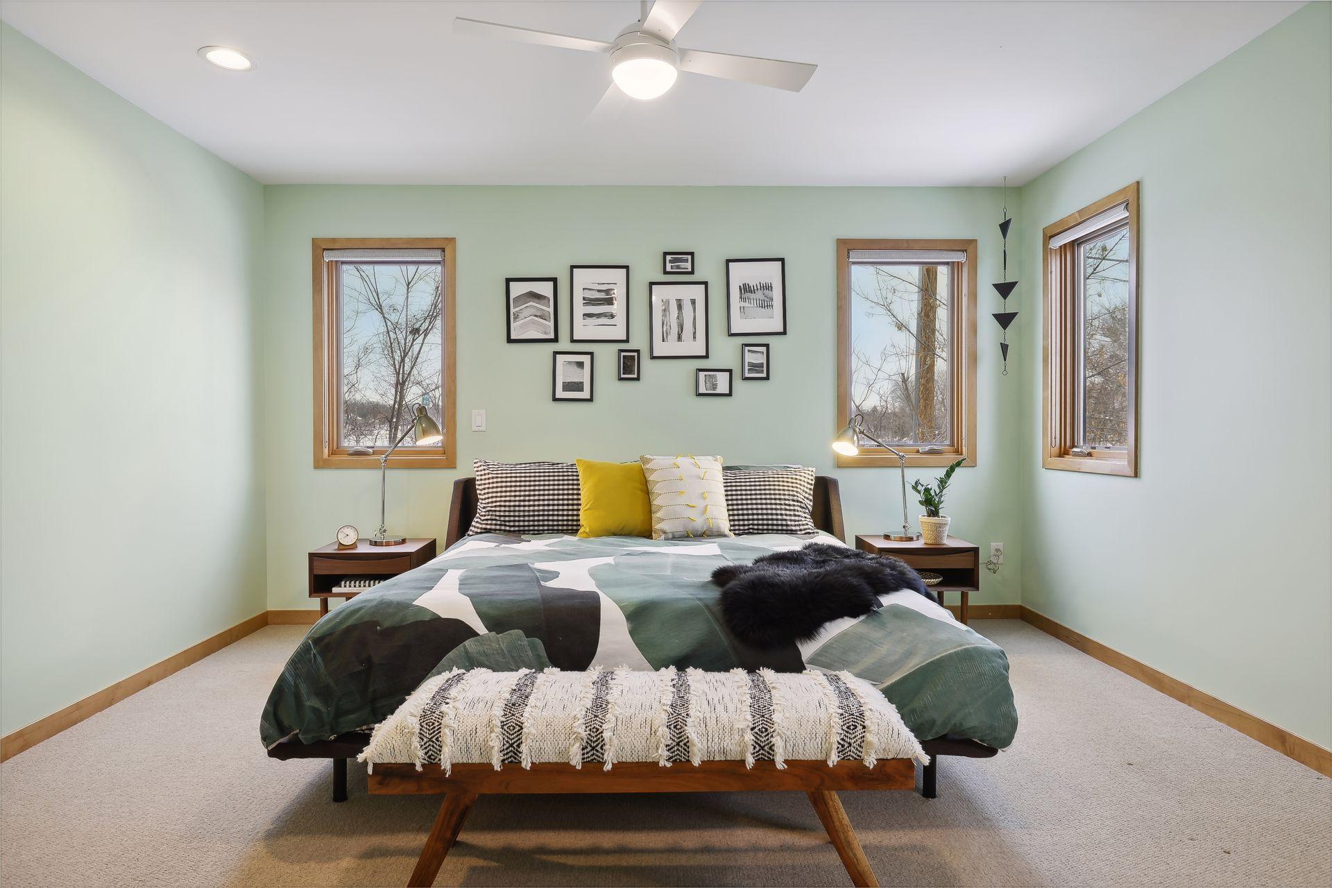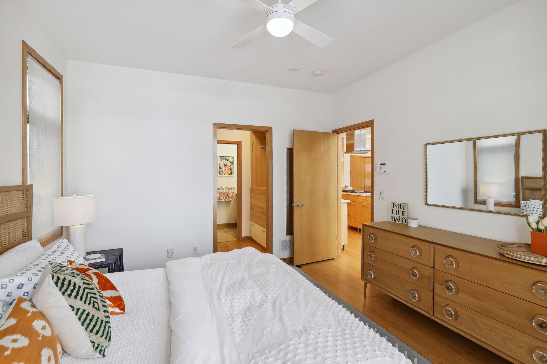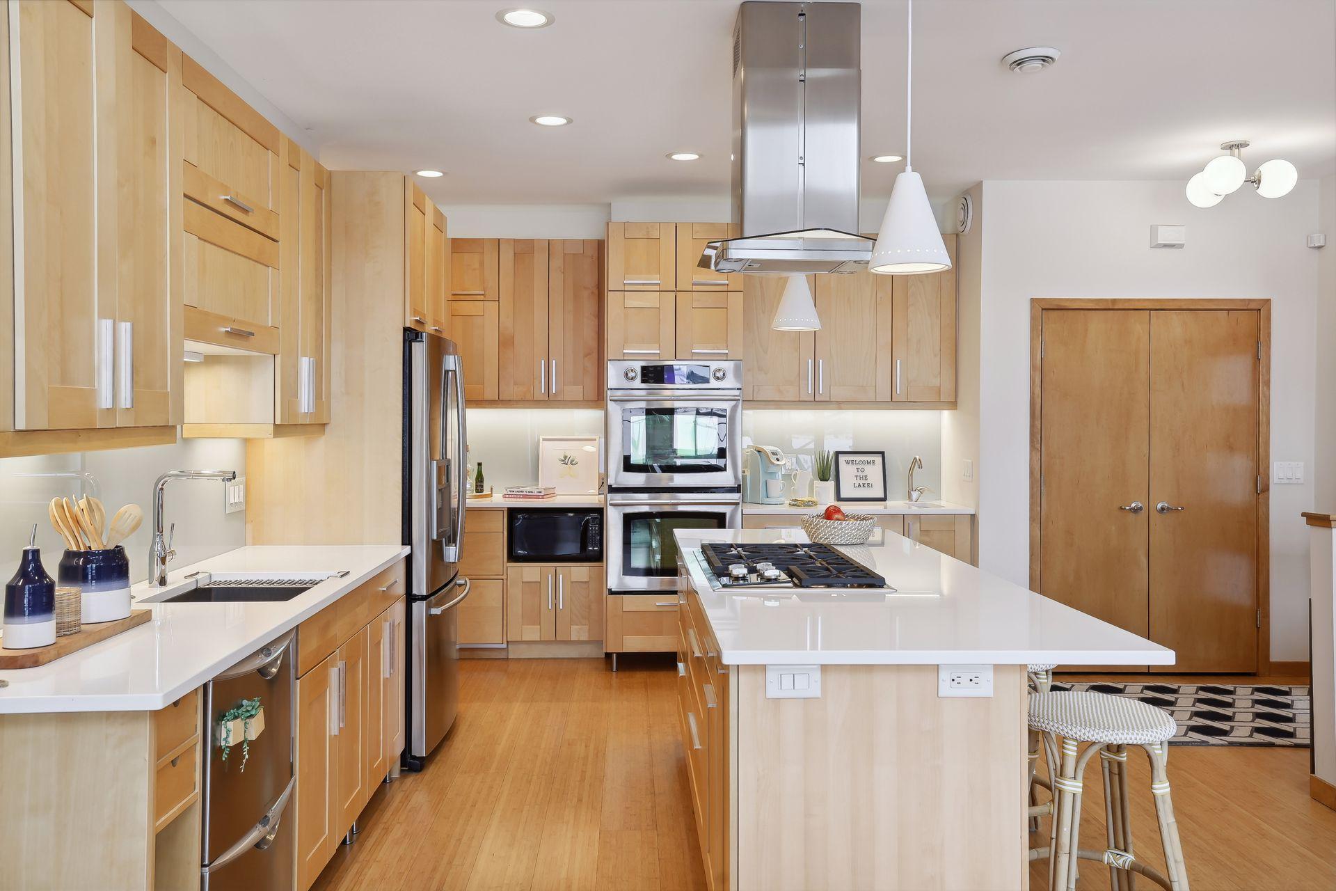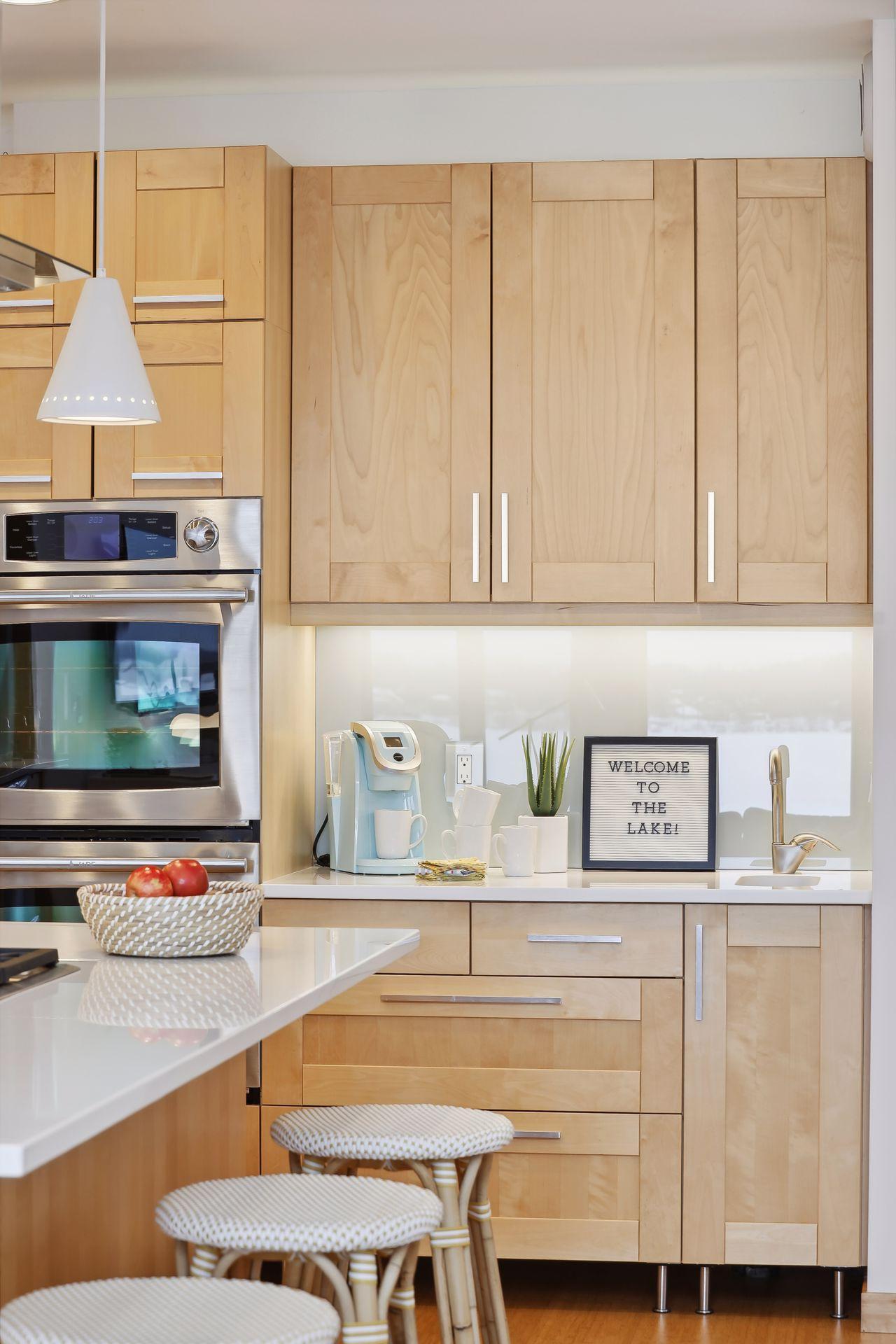serve. Just off the living room is a generously sized patio for indoor-outdoor lakeside living. The midcentury mod provides the choice of a main floor primary lakeside suite or a more private upstairs suite.