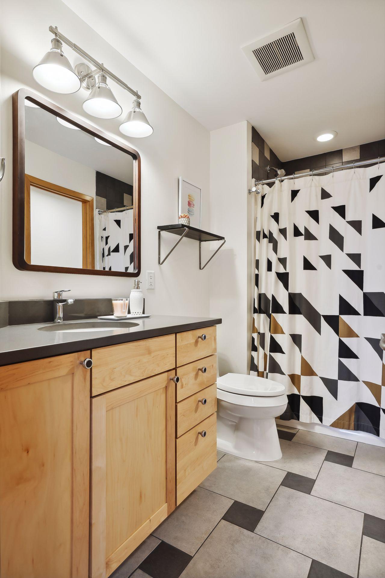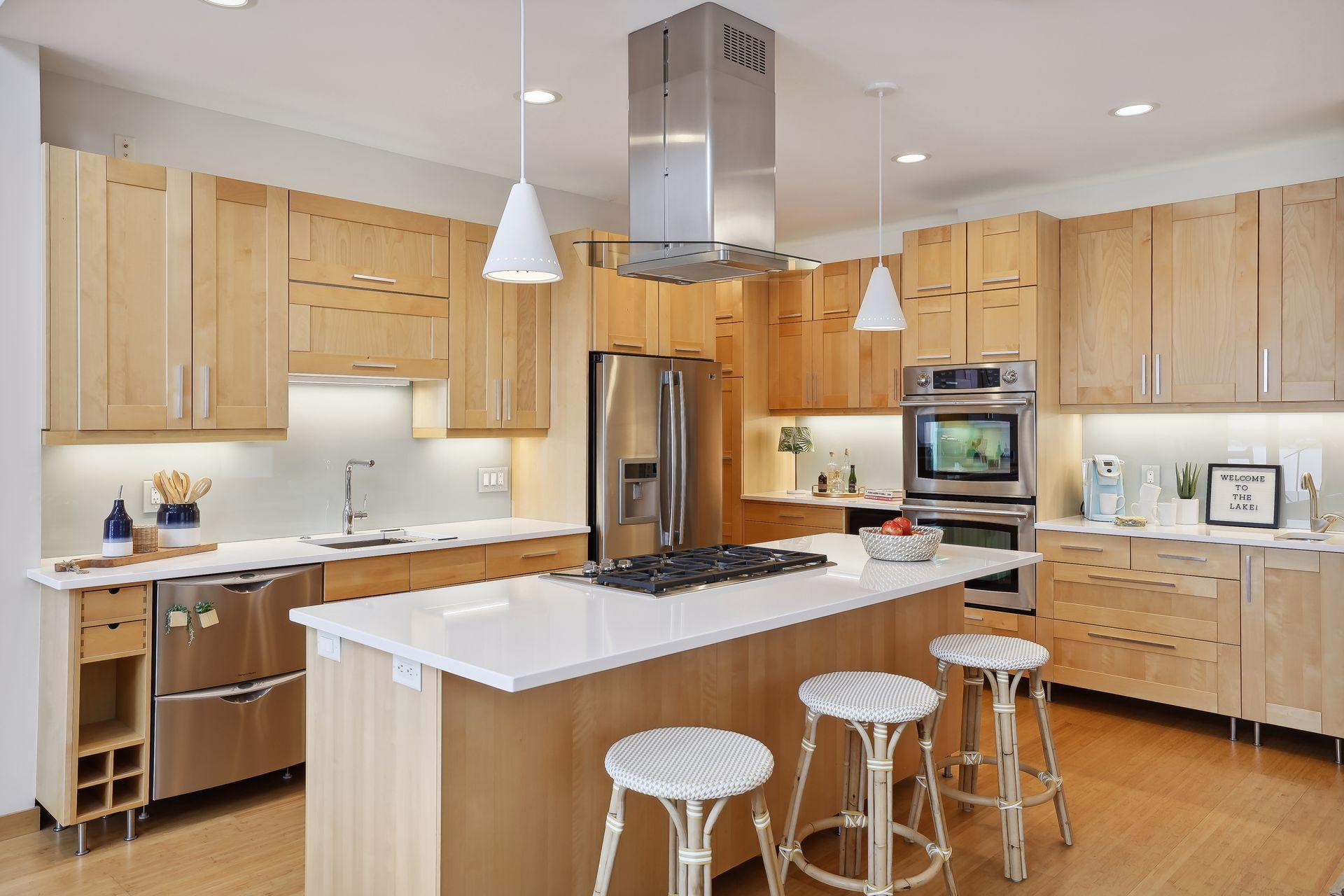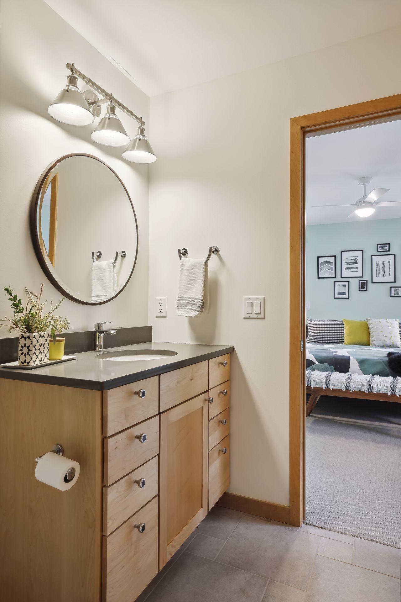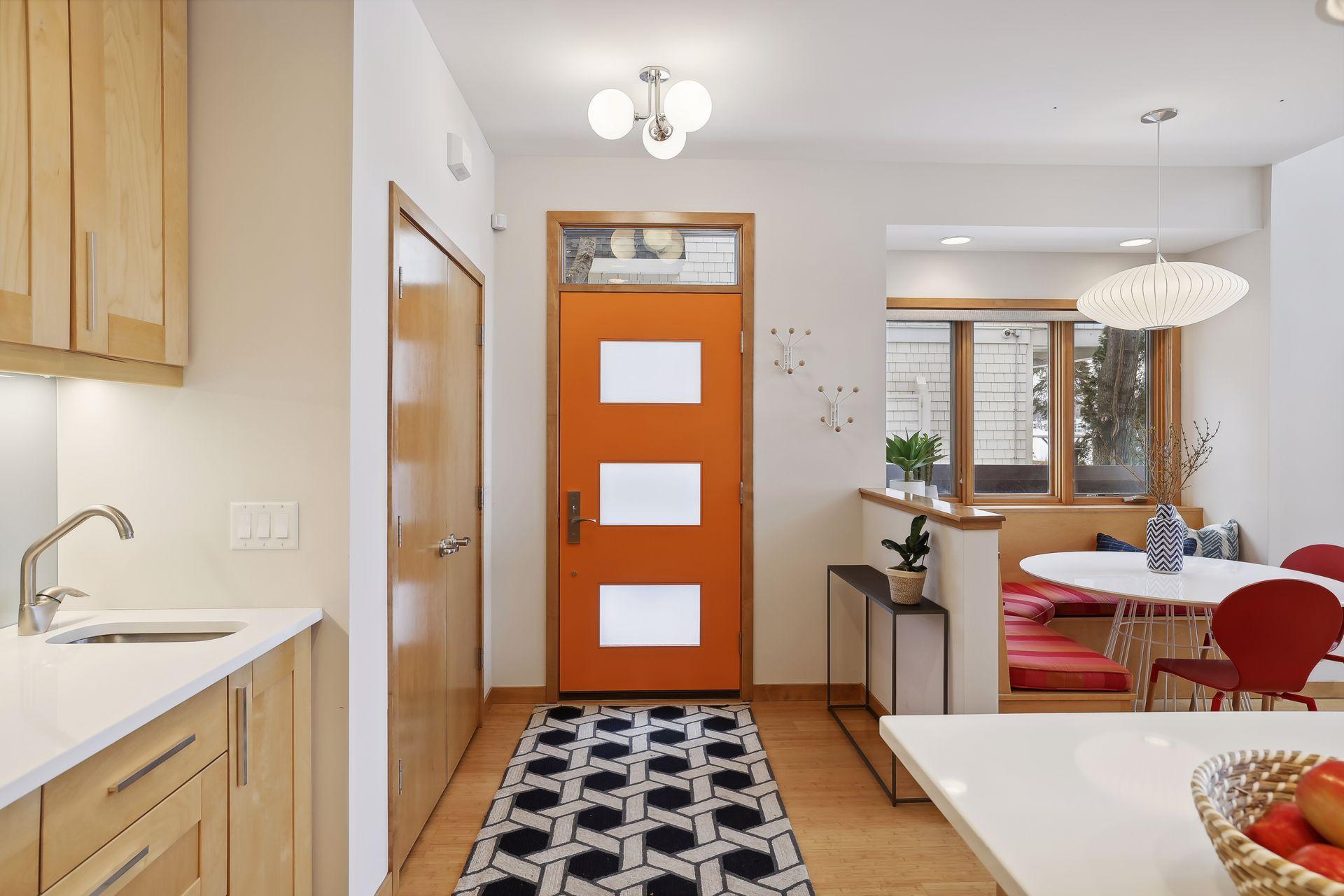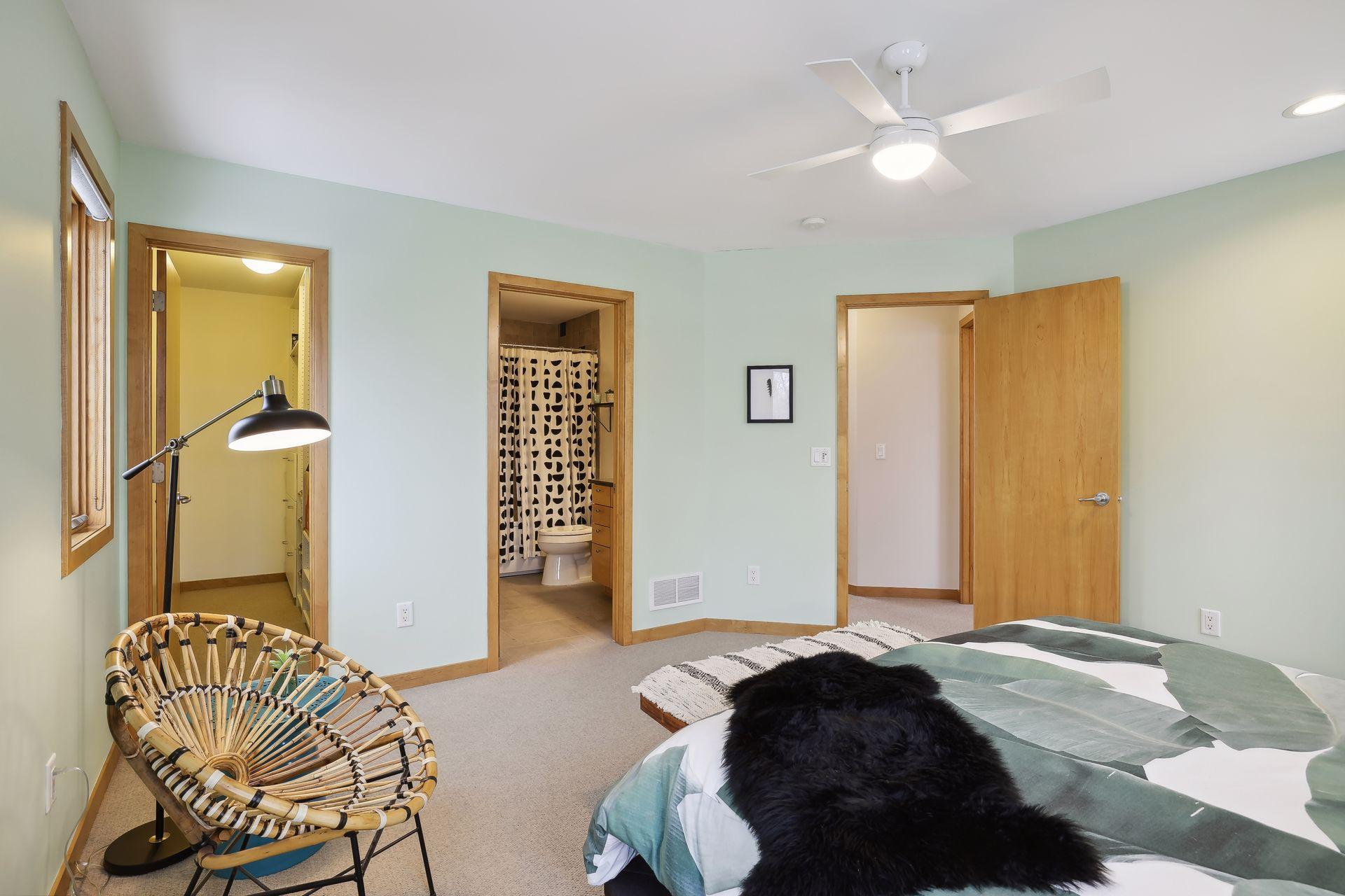 serve. Just off the living room is a generously sized patio for indoor-outdoor lakeside living. The midcentury mod provides the choice of a main floor primary lakeside suite or a more private upstairs suite.