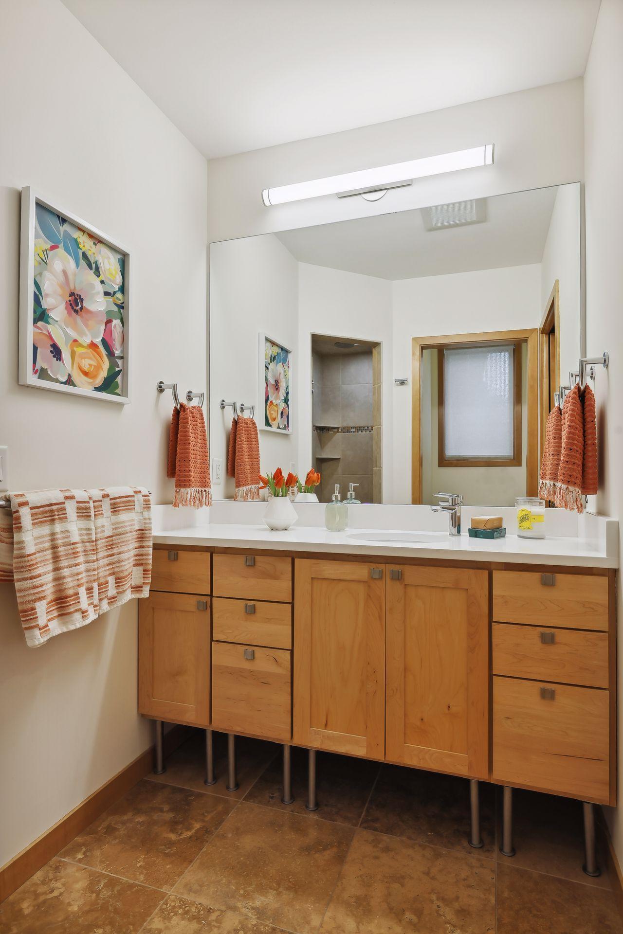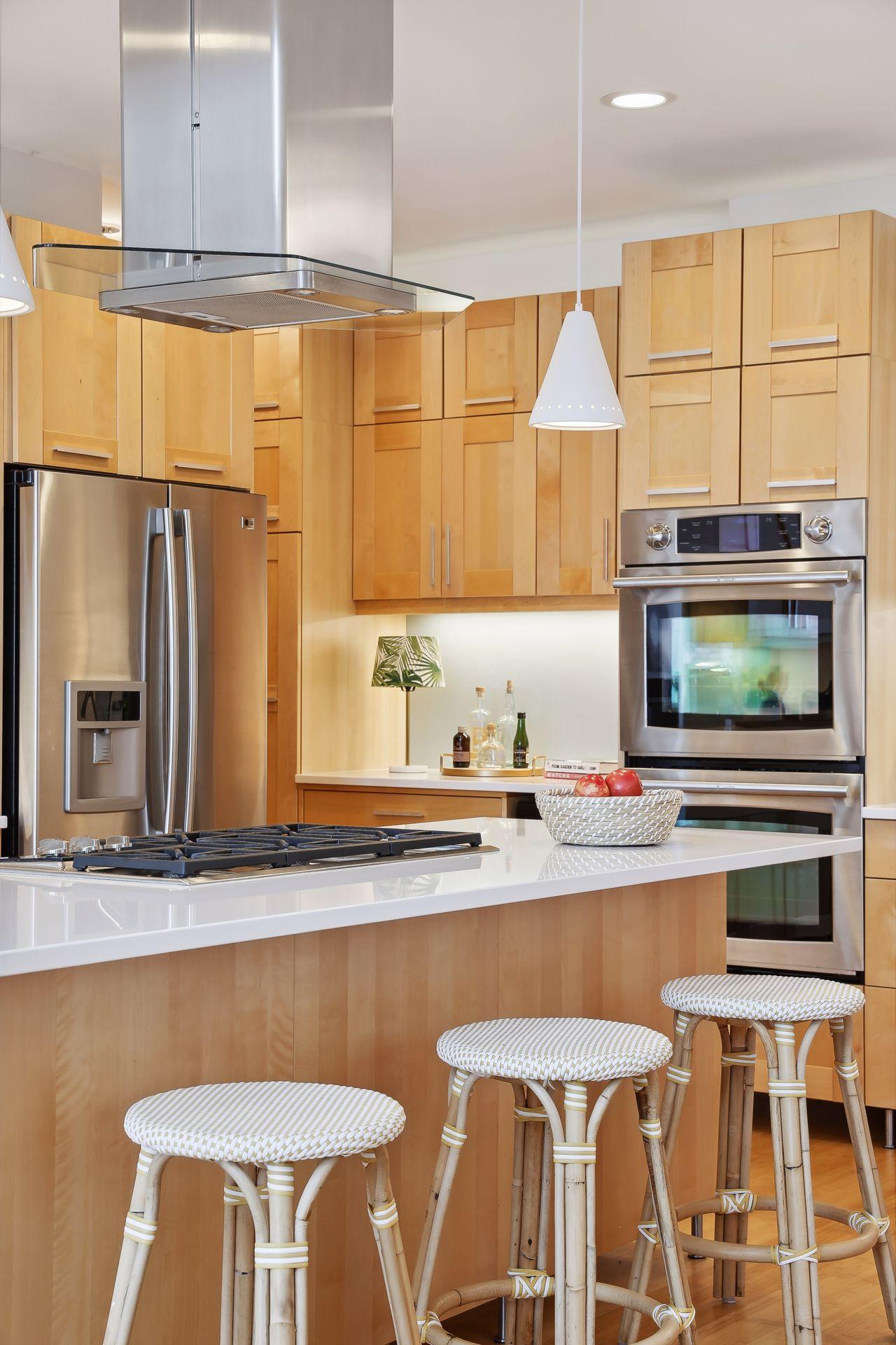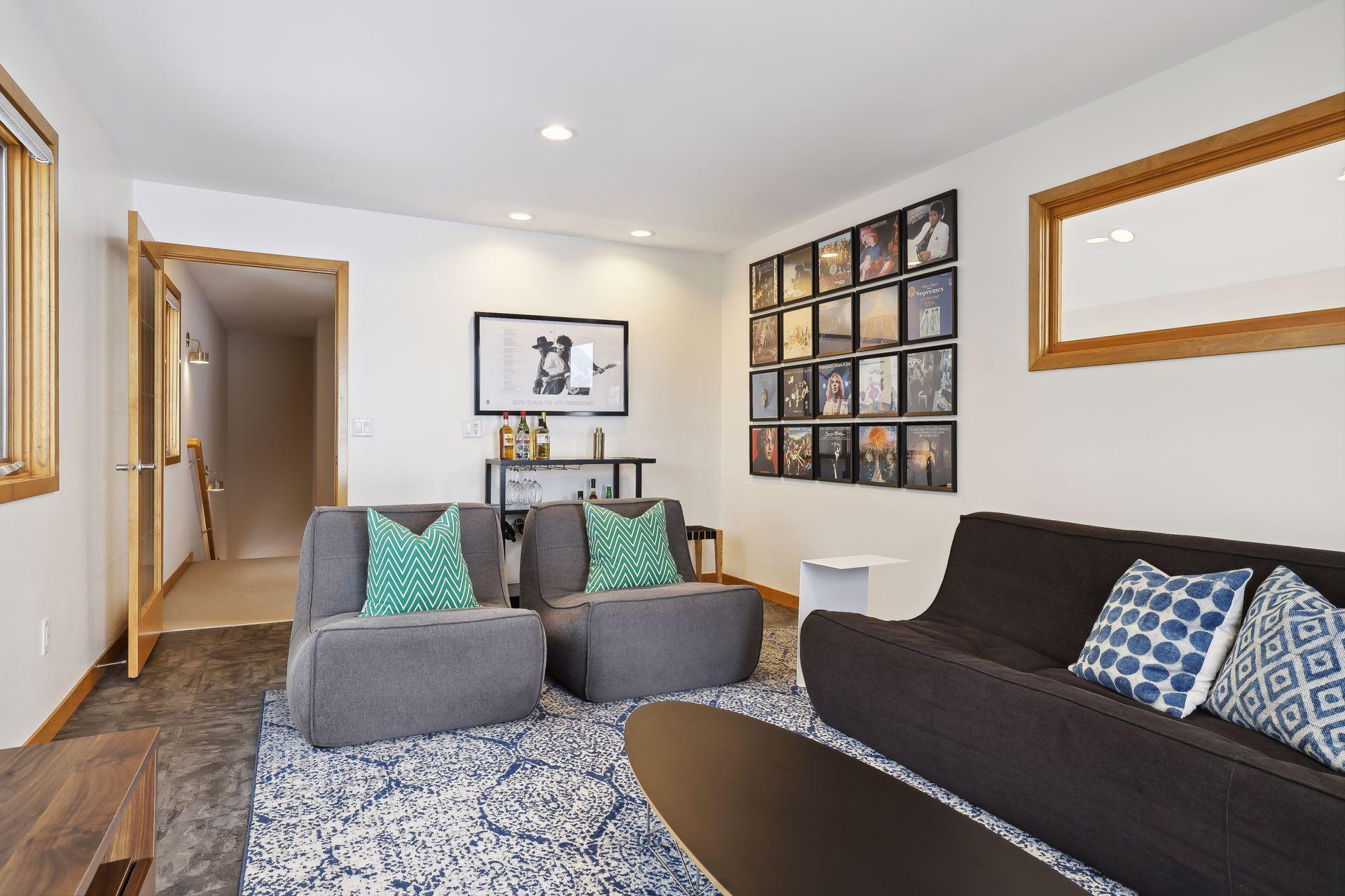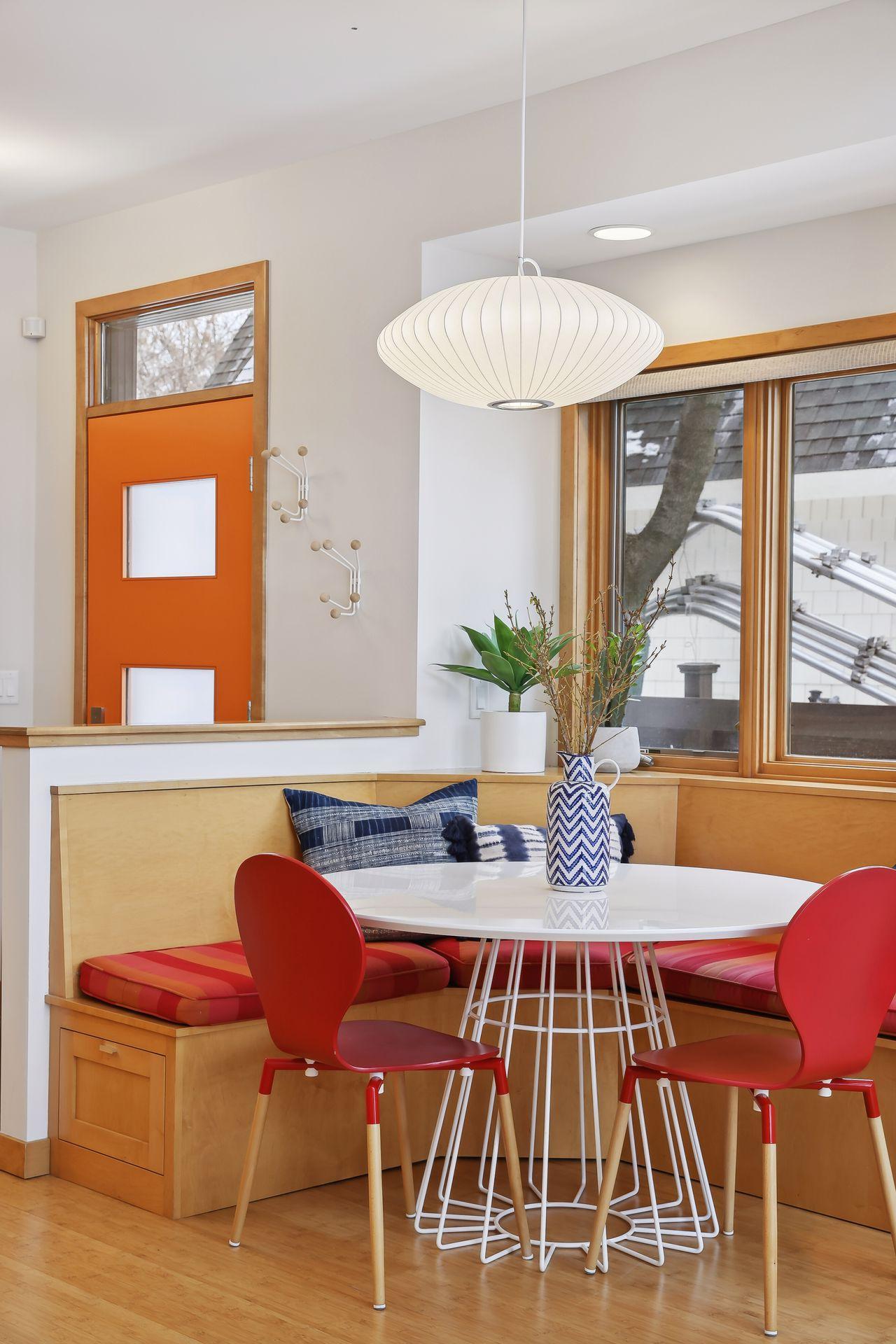 serve. Just off the living room is a generously sized patio for indoor-outdoor lakeside living. The midcentury mod provides the choice of a main floor primary lakeside suite or a more private upstairs suite.