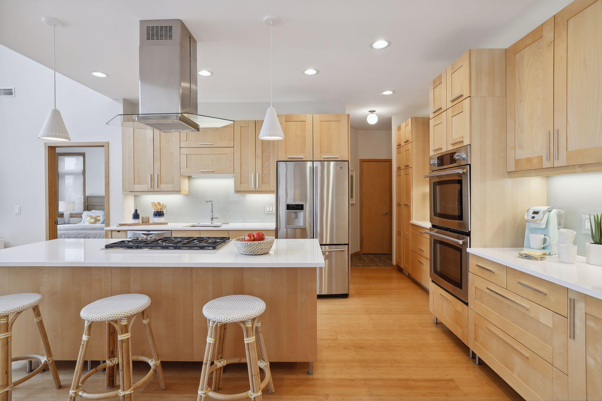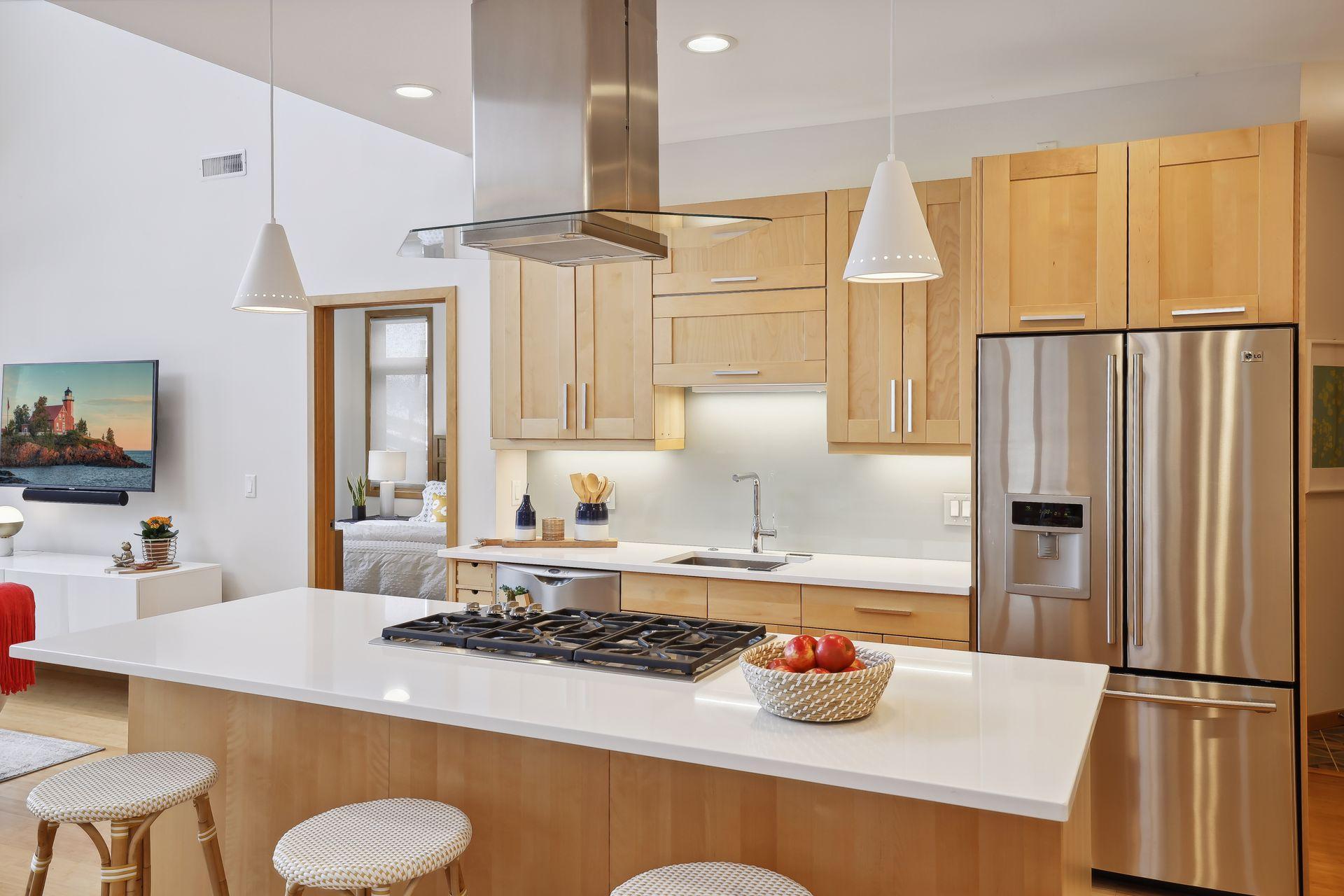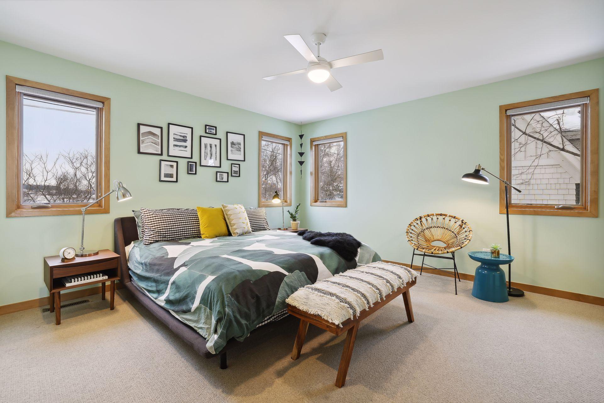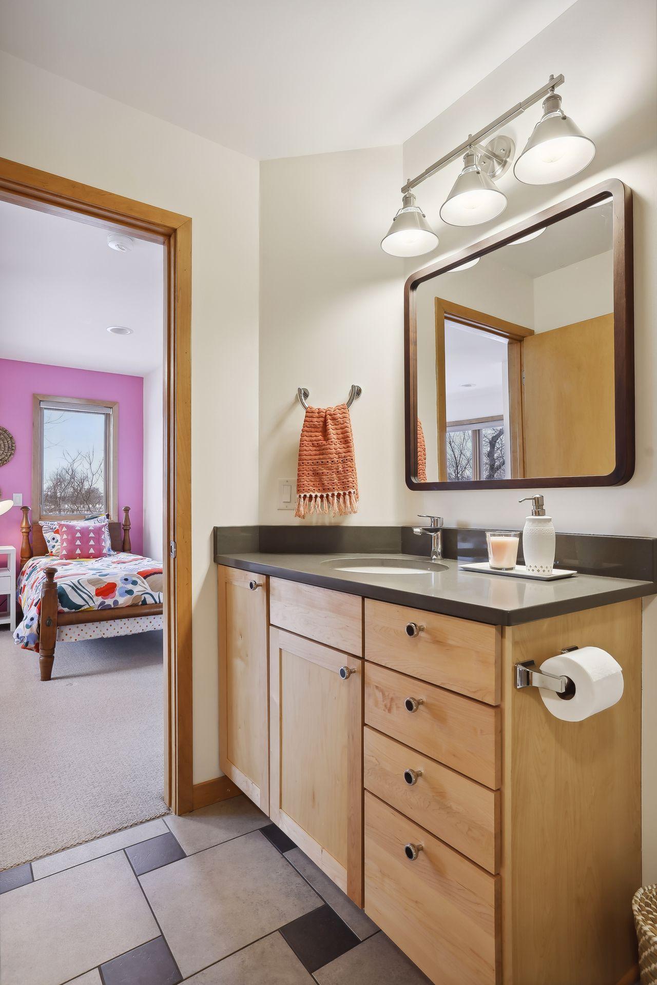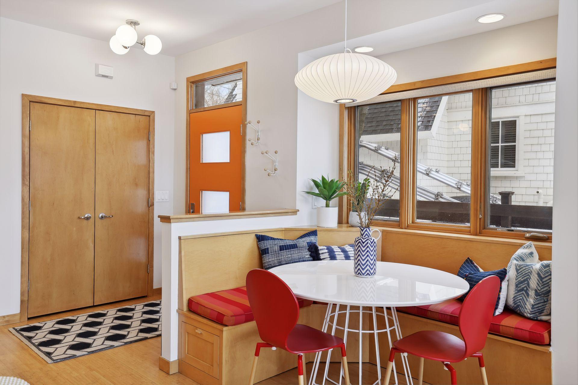 serve. Just off the living room is a generously sized patio for indoor-outdoor lakeside living. The midcentury mod provides the choice of a main floor primary lakeside suite or a more private upstairs suite.