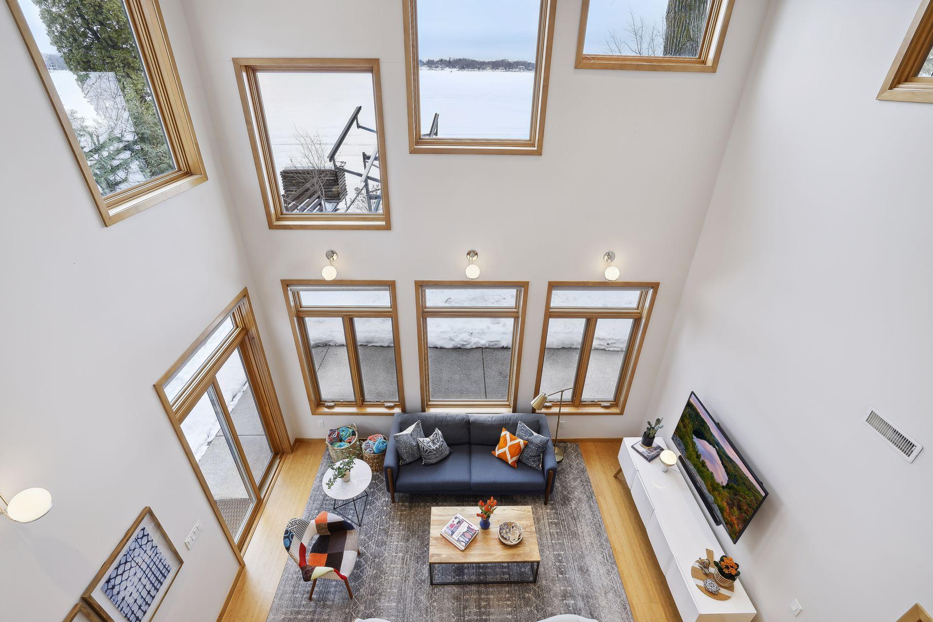 and contemporary in features. Windows blanket the vaulted lakeside wall (southeast exposure),