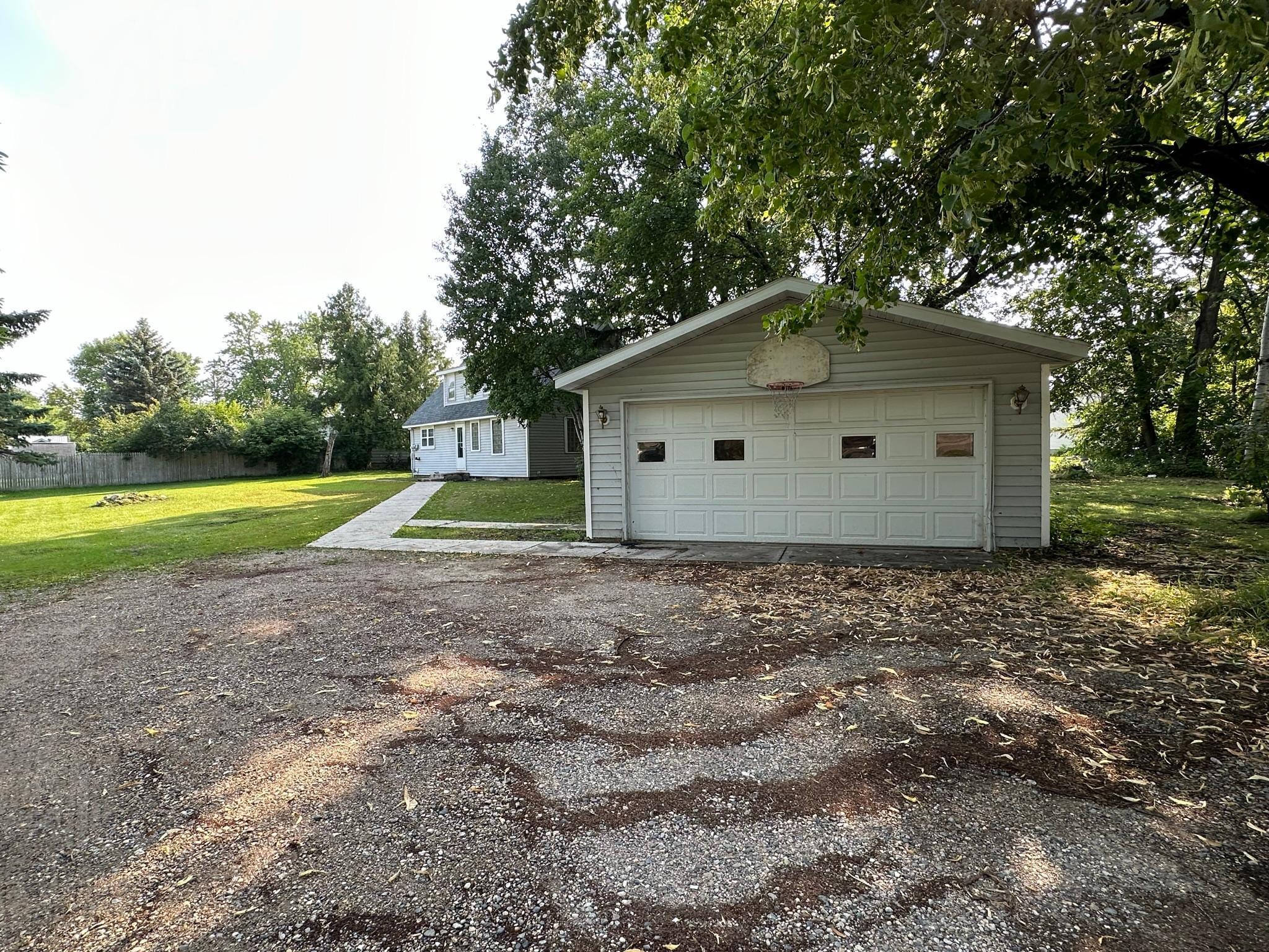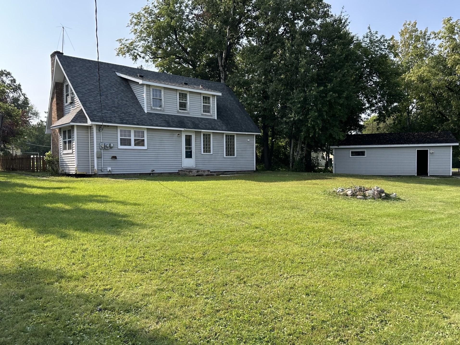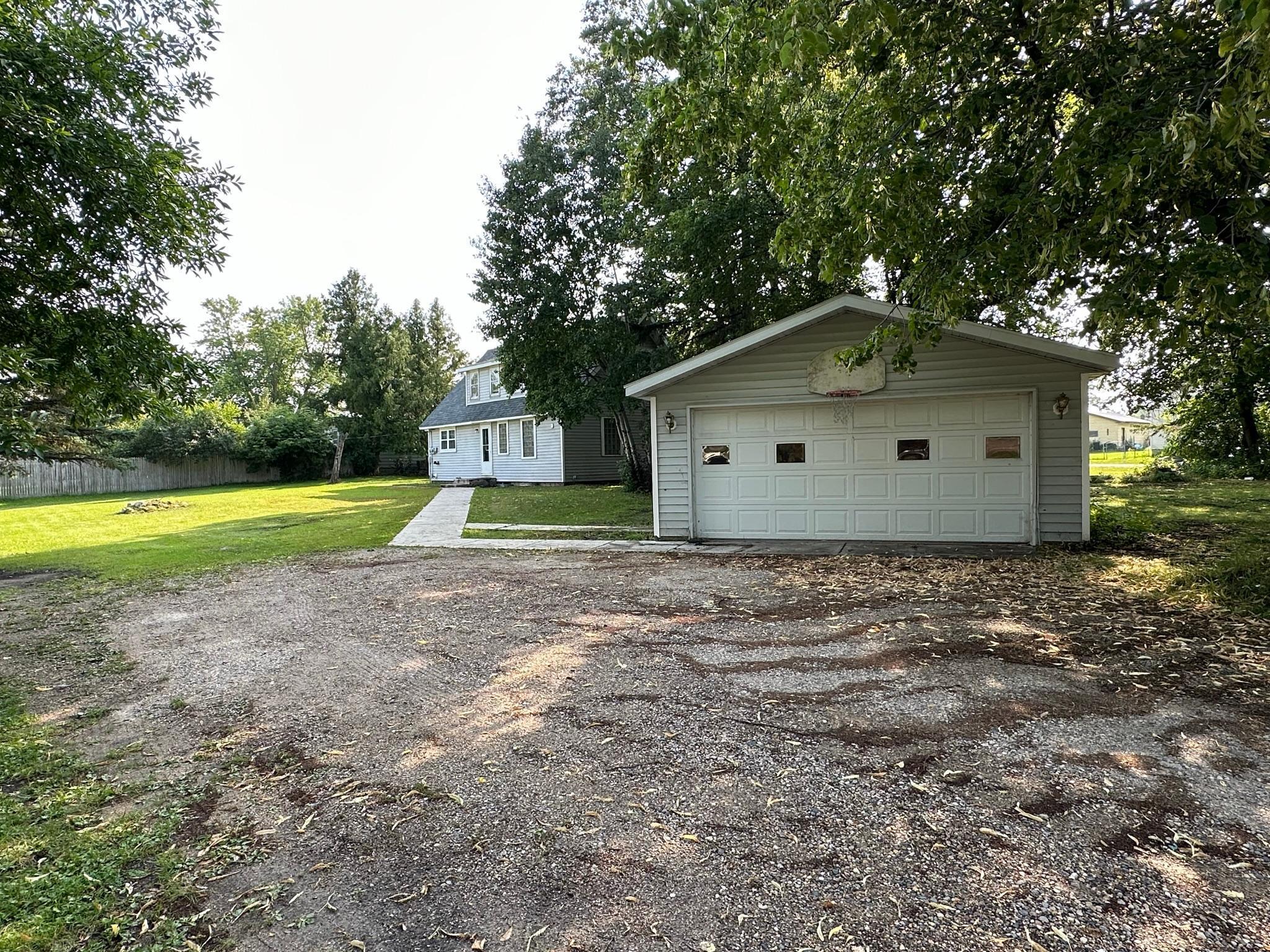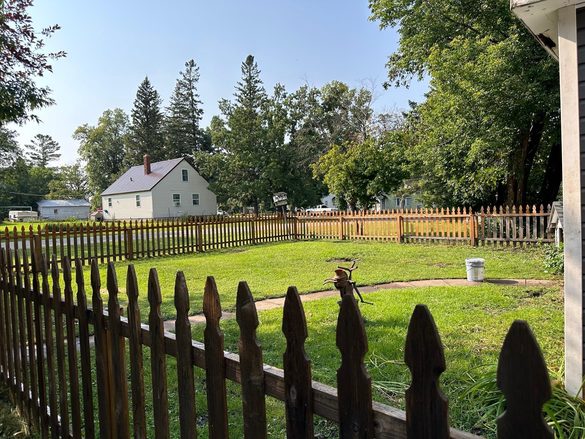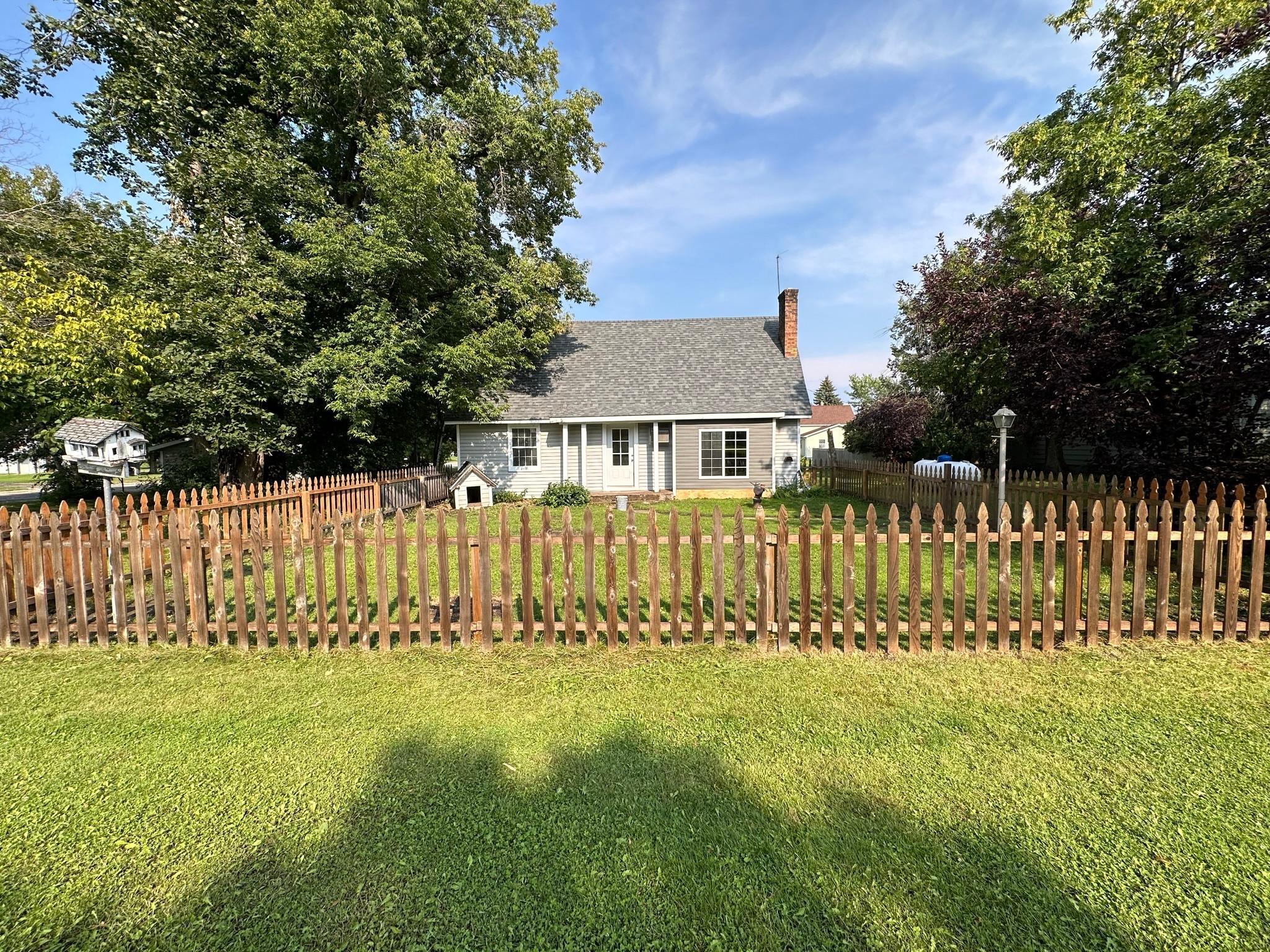 Small town living with a picket fenced front yard! This home sits on an in-town corner lot and has a double detached garage, large picture window and fireplace in living room, open kitchen/living, main level bedroom with two more upstairs, full bath with jetted tub, storage basement and a spacious yard.