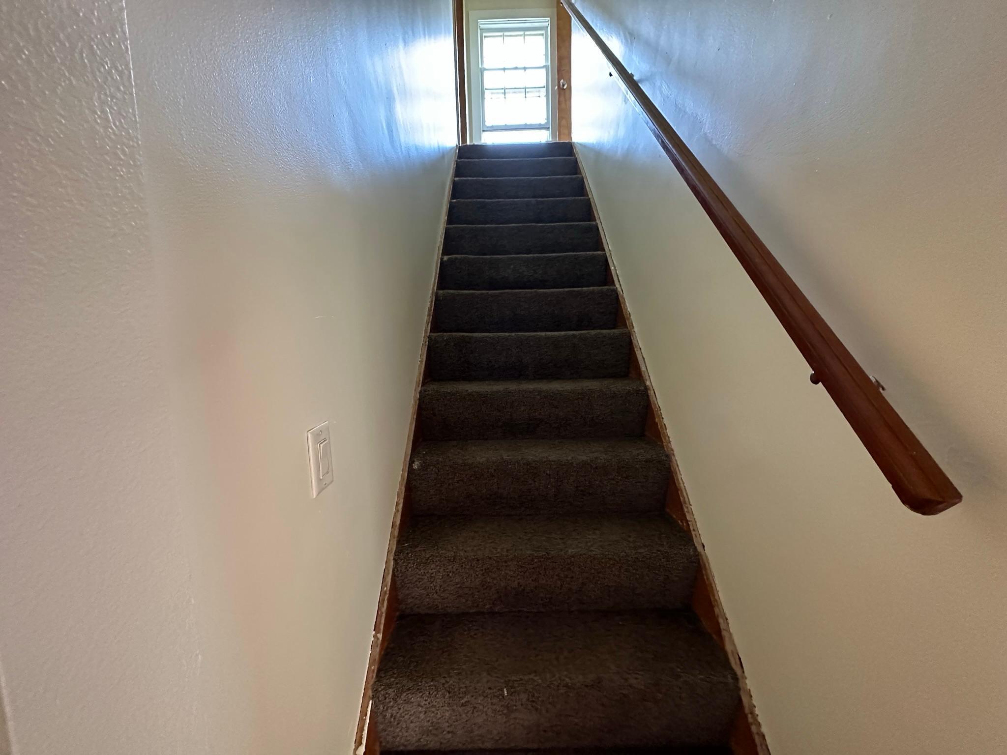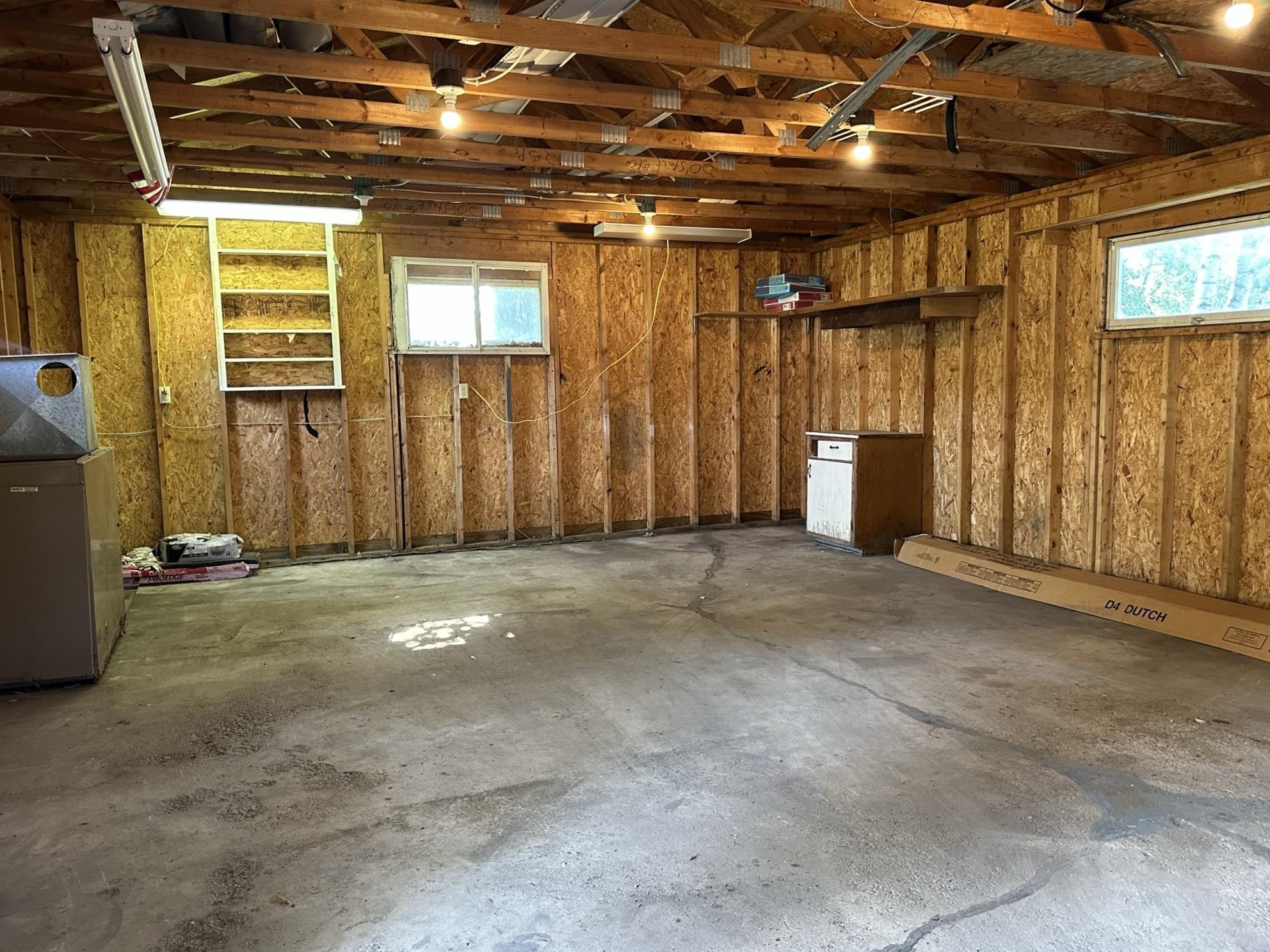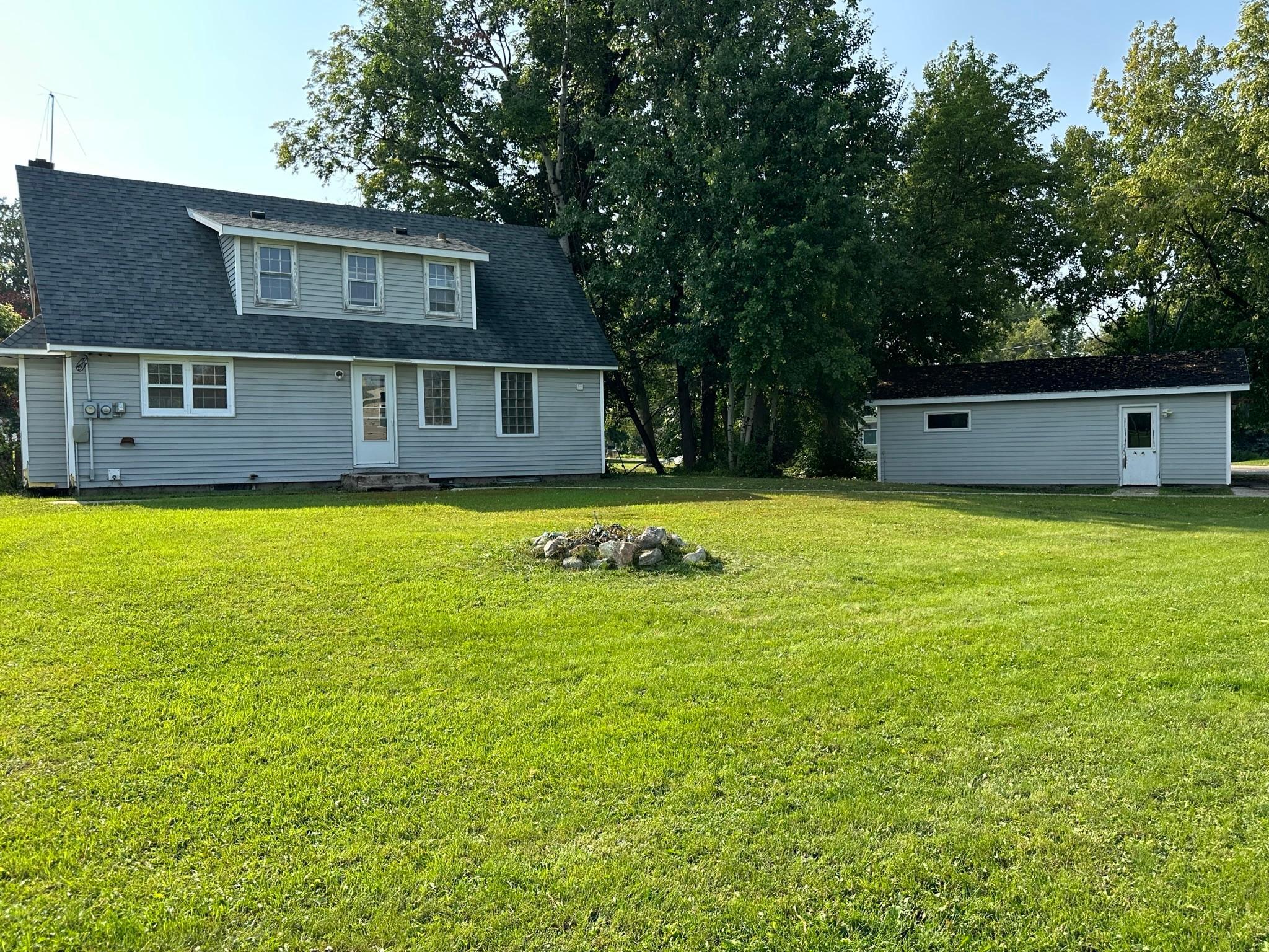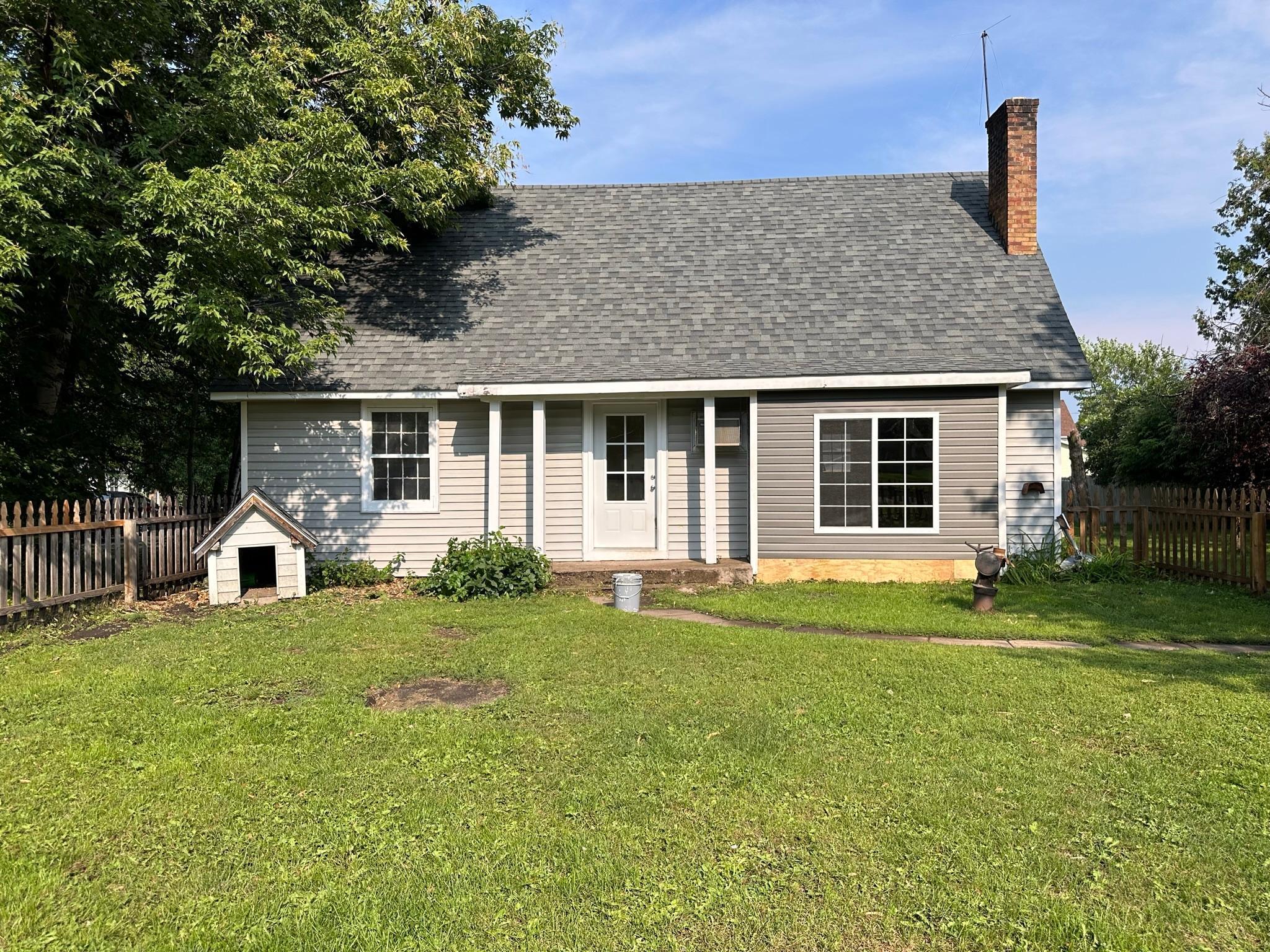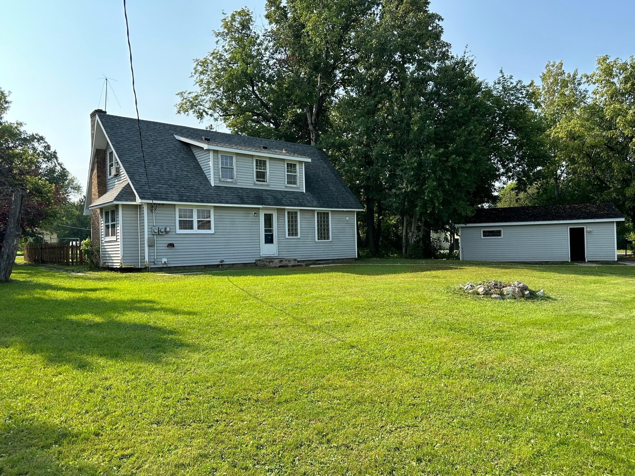 Small town living with a picket fenced front yard! This home sits on an in-town corner lot and has a double detached garage, large picture window and fireplace in living room, open kitchen/living, main level bedroom with two more upstairs, full bath with jetted tub, storage basement and a spacious yard.