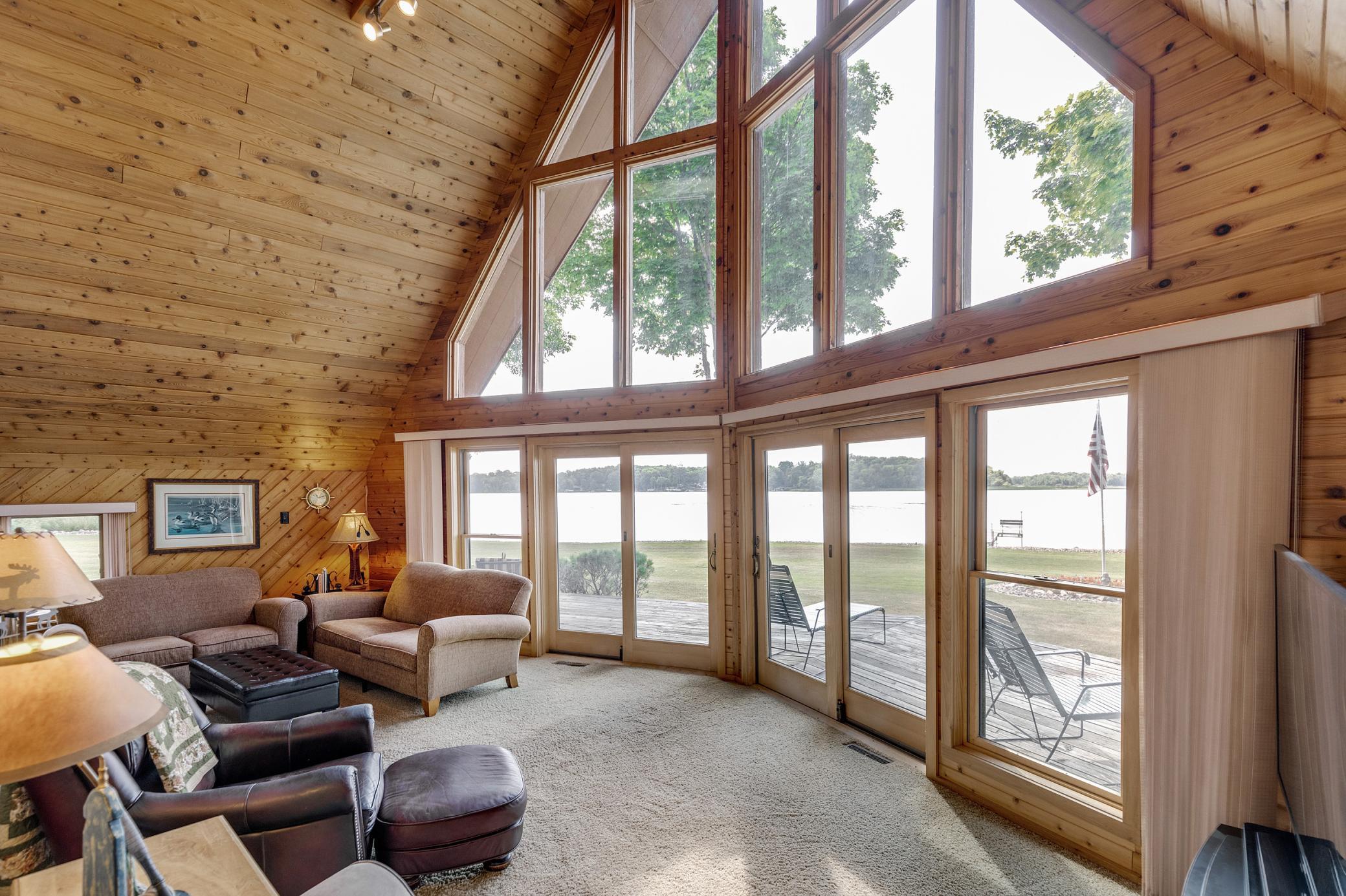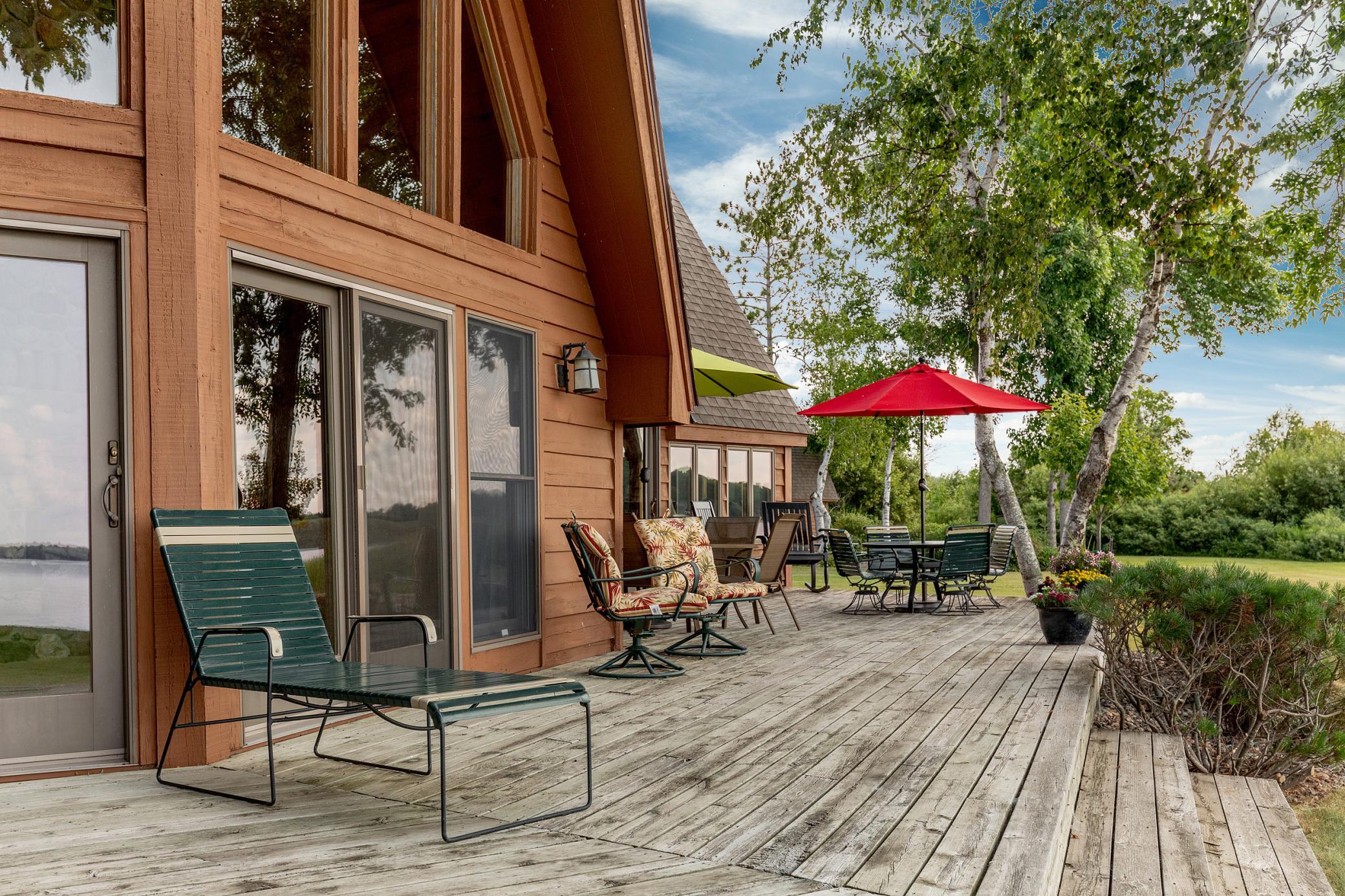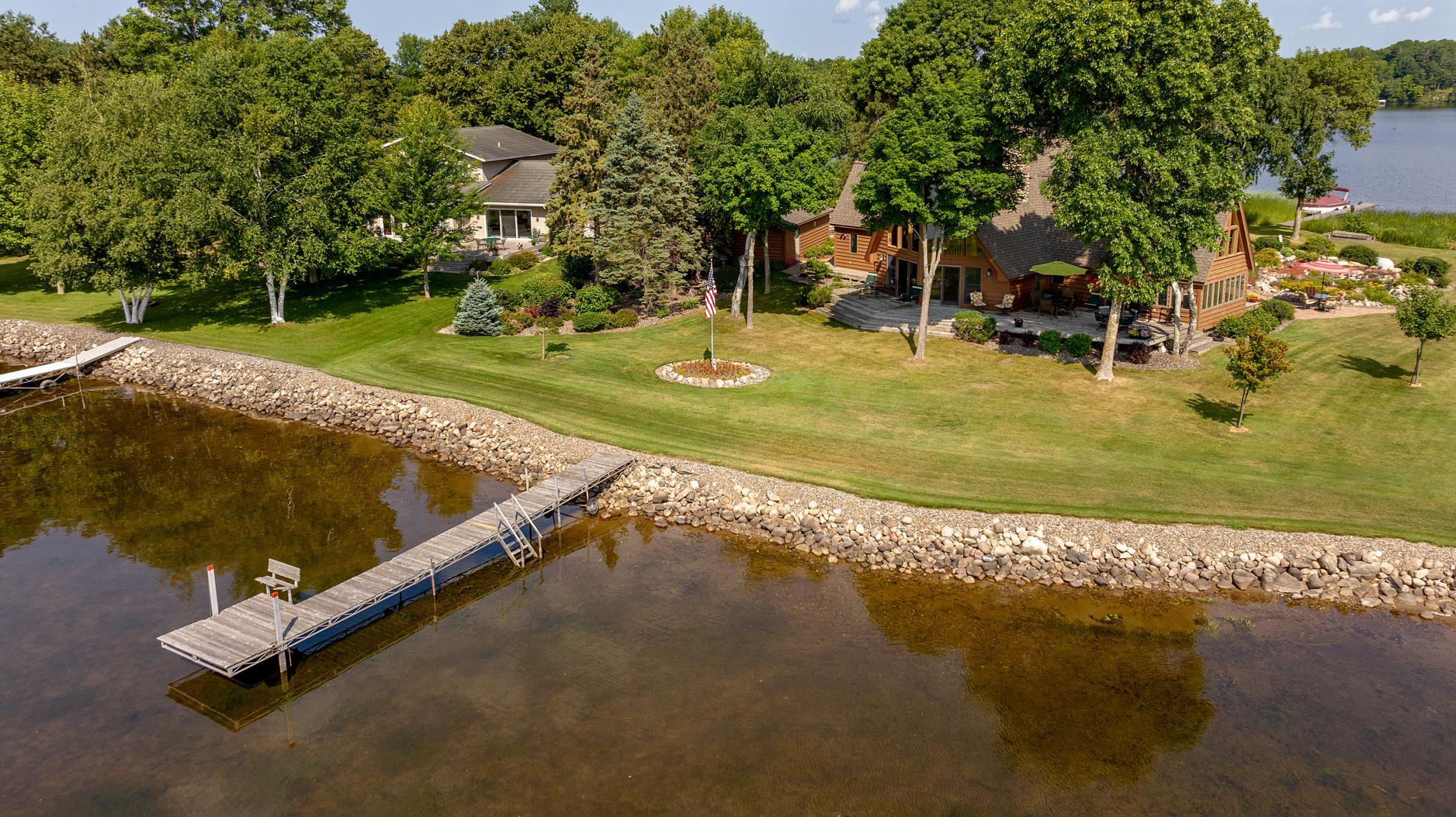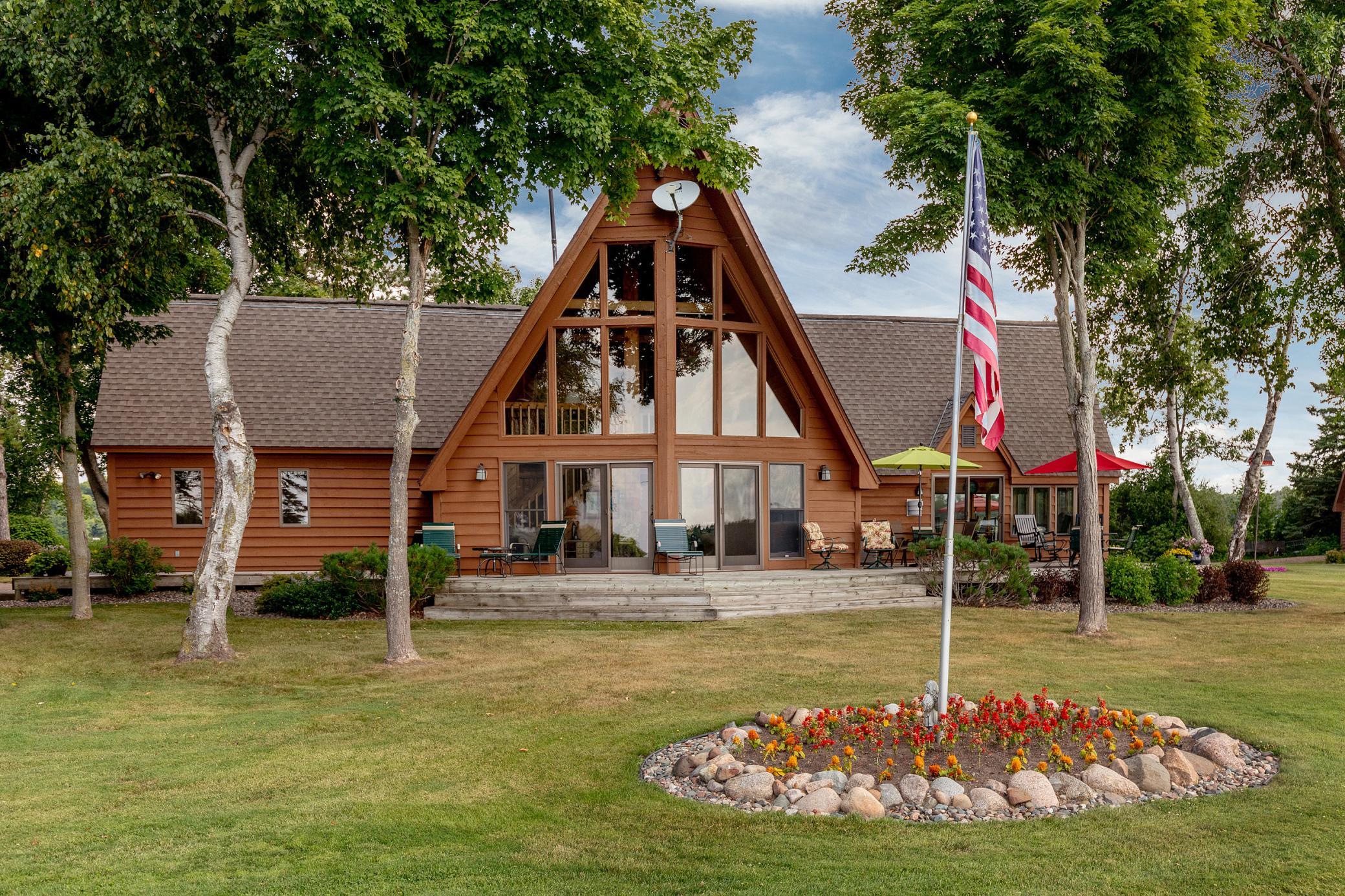 Spectacular grounds with incredible landscaping and flower gardens, and panoramic views with end-of-road privacy on a peninsula overlooking Farm Island Lake! This beautifully maintained cedar-sided home was designed with lake visibility from near every room, including great room and loft, sun room, and every bedroom. Enjoy lakeside entertaining from the wraparound deck, patios or large front yard overlooking more than 650 feet of both hard sand and natural waterfront. A two stall garage and large storage shed round out this stunning property on Farm Island Lake!