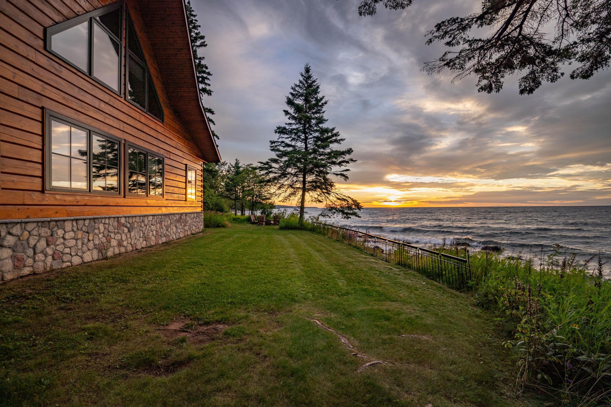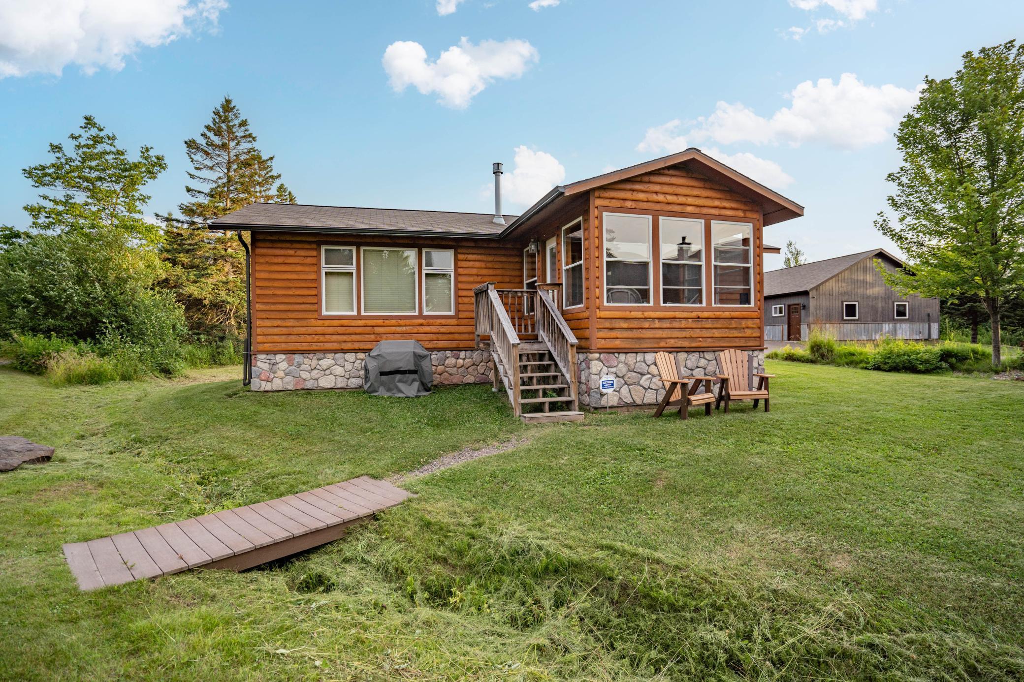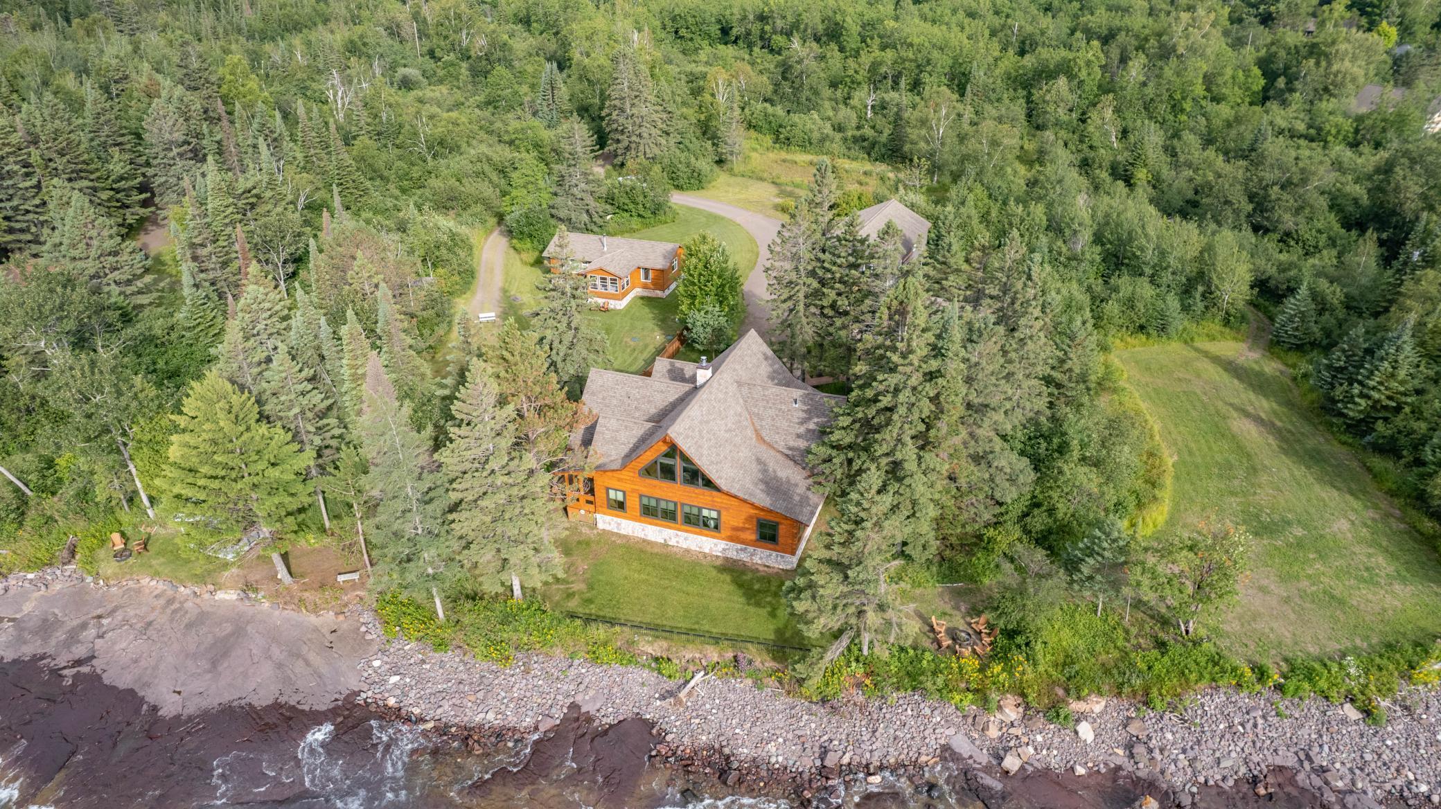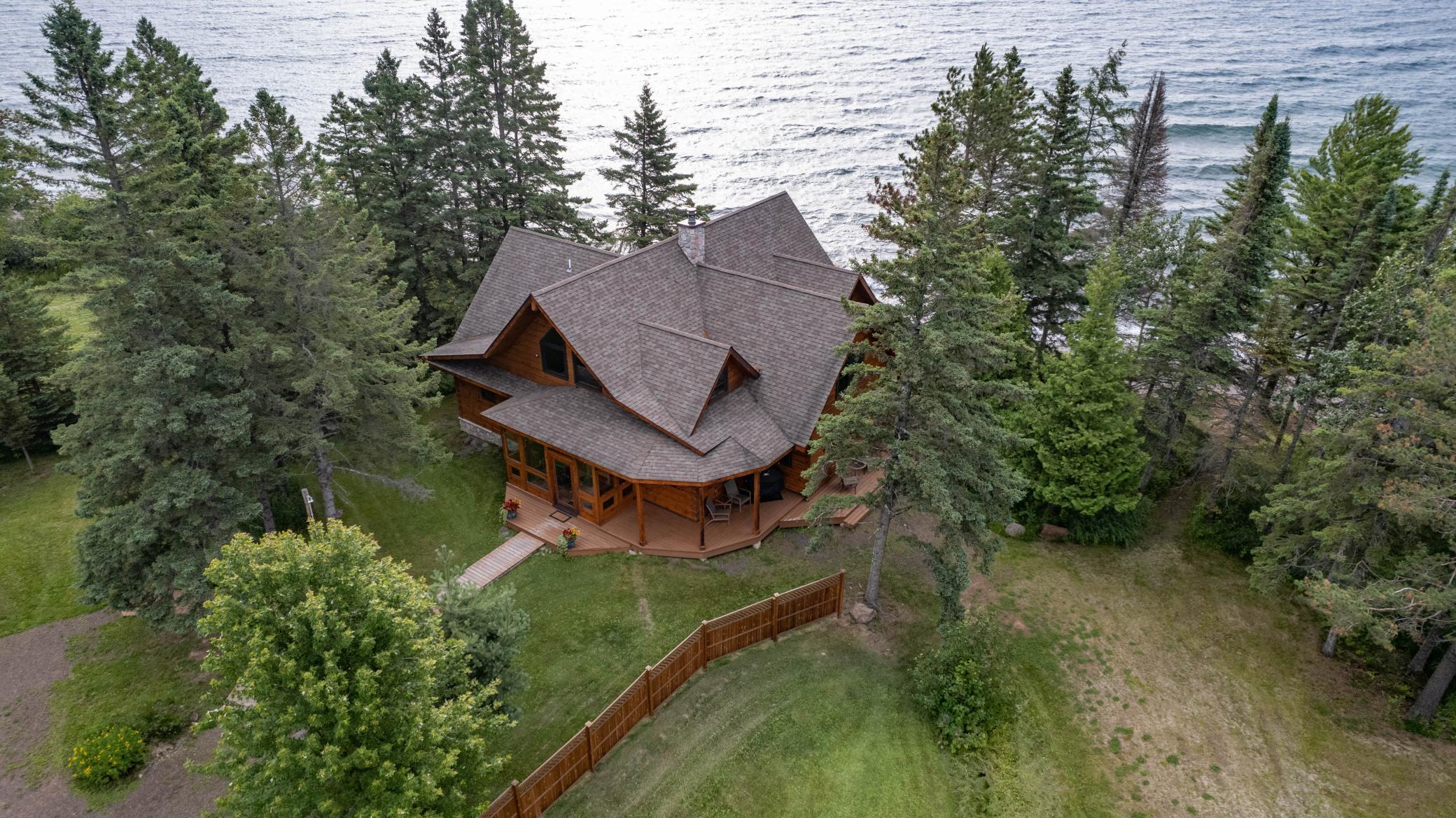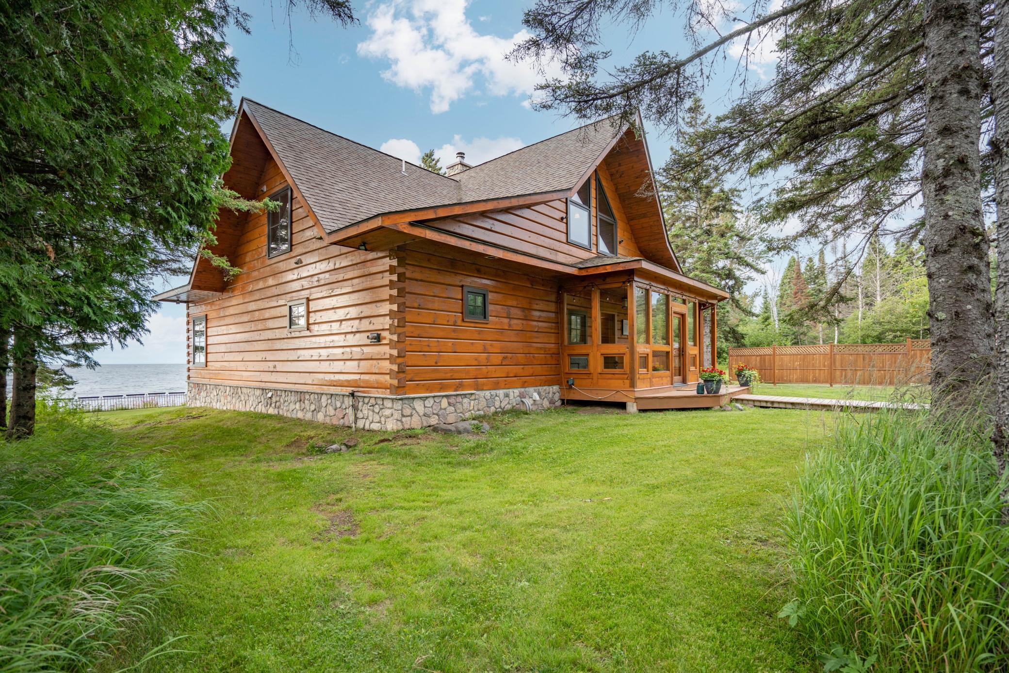 Public Remarks: Beautiful custom log home with guest cabin 2 detached garages and a screen house at the waters edge. This home is stunning with a large kitchen withcenter island and beautiful custom cabinets, large living area with wood burning fireplace that overlooks Lake Superior. The main floor also has an office,bedroom, full bath and laundry area with ample of storage. Upstairs you will find the primary suite with large windows with stunning views, a reading nookand a bedroom. The property includes a 46x28 heated & insulated garage, a 24x24 garage, screen house just inches from the water, and a guest house.The guest house is 20x40 with a 12x12 sun room, a large king bedroom and a living/kitchen that looks to the lake. This 11 acre property is zonedcommercial/resort and can host rentals with the county.