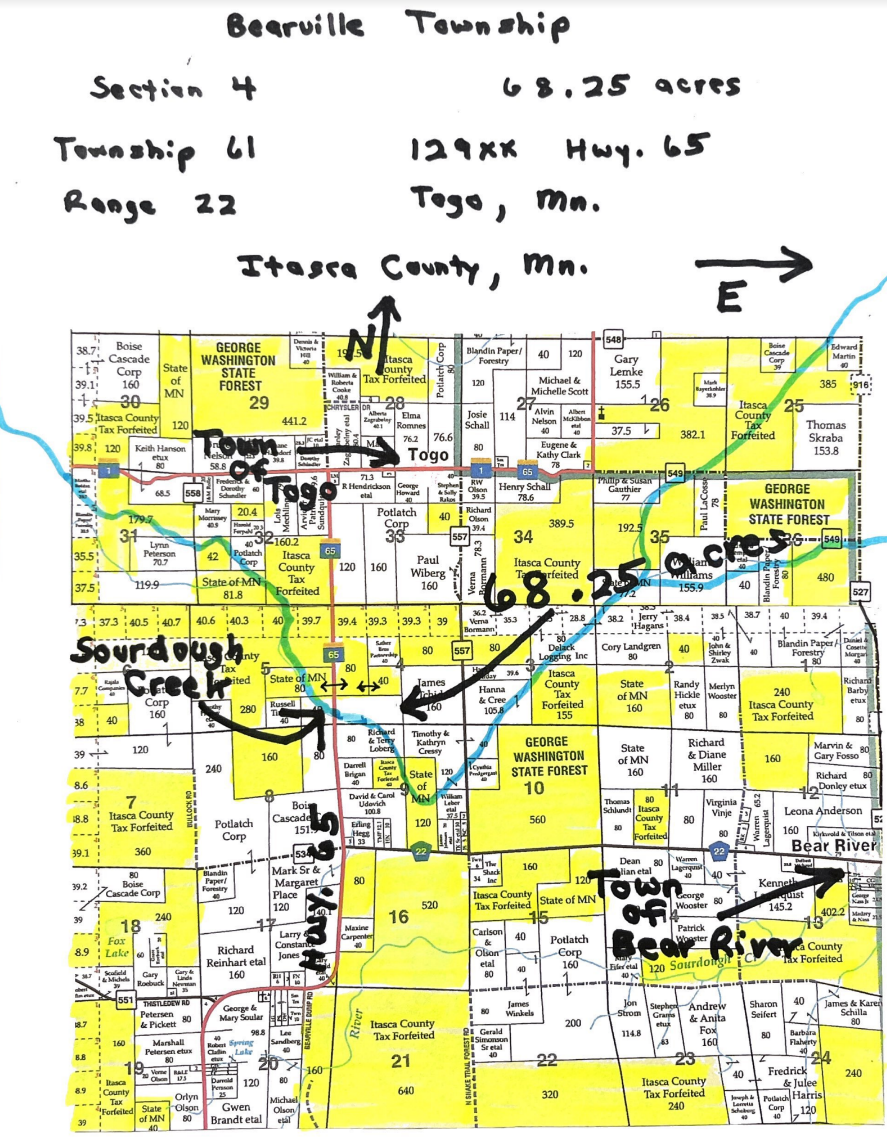 Directions: This 68 acres lays just north of the home at 62932 State Highway 65, just south of Togo, Mn.