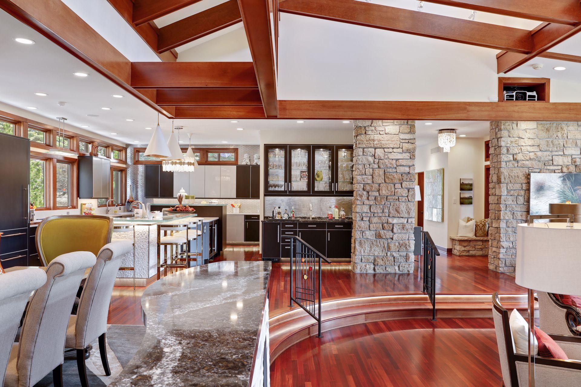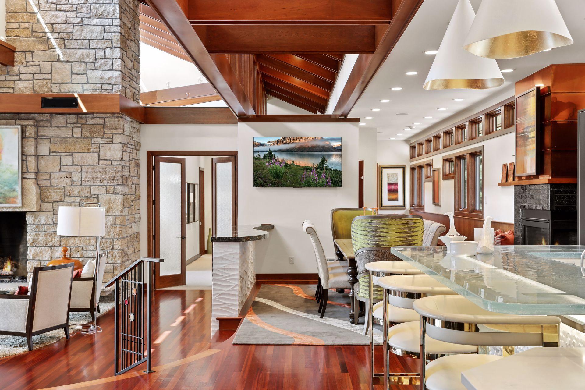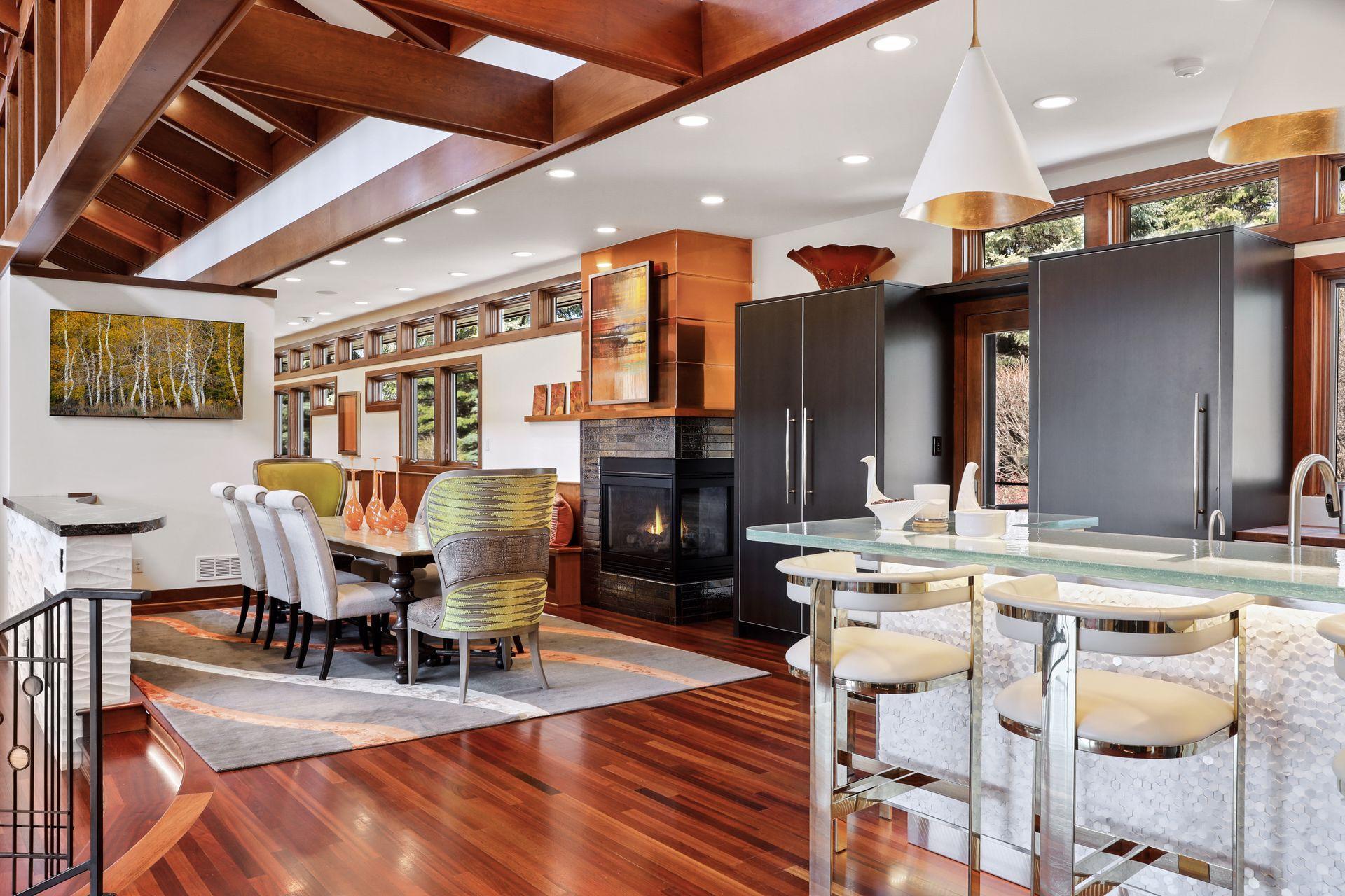 Amenities Unit: Exercise Room; Hardwood Floors; In-Ground Sprinkler; Kitchen Center Island; Kitchen Window; Main Floor Primary Bedroom; Natural Woodwork; Patio; Porch; Primary Bedroom Walk-In Closet; Sauna; Security System; Skylight; Tile Floors; Vaulted Ceiling(s); Walk-In Closet; Washer/Dryer Hookup; Wet Bar